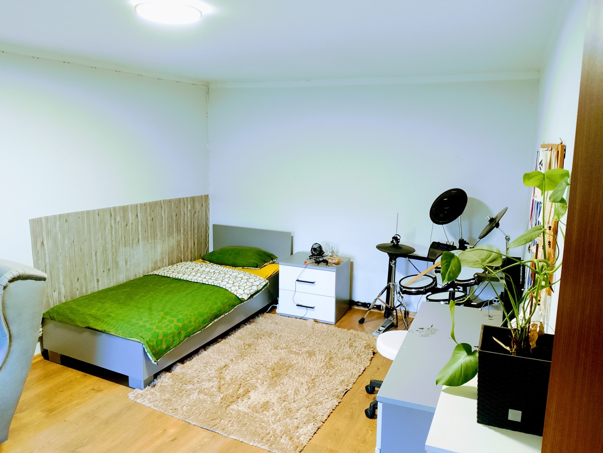 5 przestronnych pokoi,kuchnia z jadalnią,łazienka z toaletą, piwnica-wejscie z domu( piec samozasypowy 5-generacji na ekogroszek ),strych (40m2),pod domem 2 miejsca parkingowe,na posesji wolnostojący przestronny garaż z nową bramą( z prądem i kanałem).Gaz w ulicy.