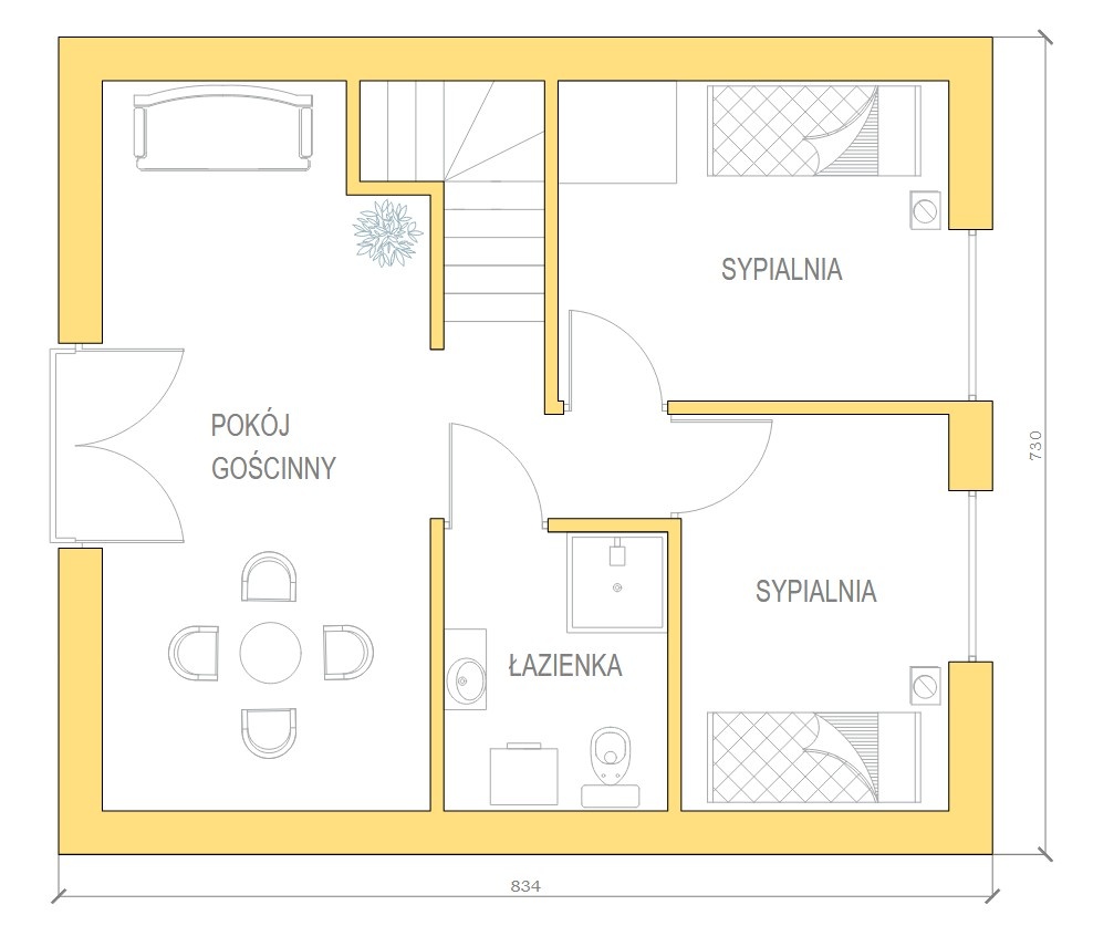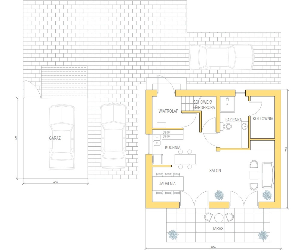 Układ pomieszczeń: Na dole salon, 31m2 z otwartą kuchnią i jadalnią. Oprócz tego łazienka i kotłownia.