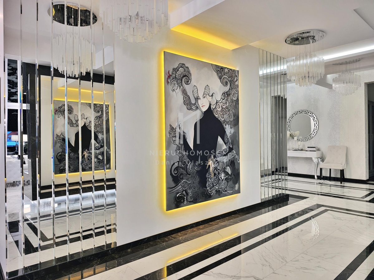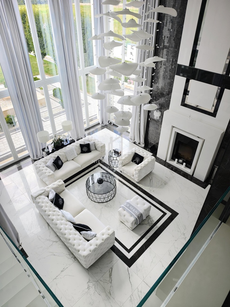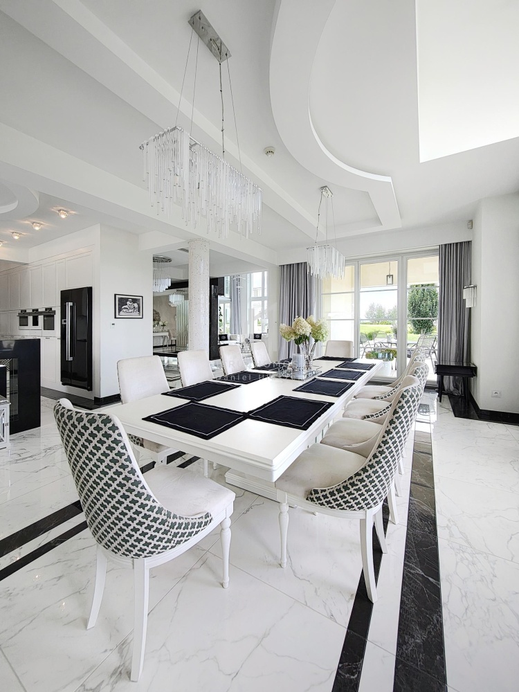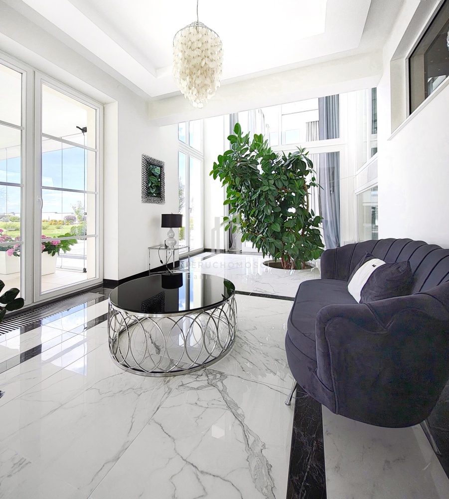 • przestronny salon z kominkiem i imponującym żyrandolem oraz wygodnym kompletem wypoczynkowym z włoskiego weluru, które w połączeniu z wysoką na 6 metry przestrzenią sufitową i panoramicznymi przeszkleniami w stylu francuskim wychodzącymi na ogród i taras - zapewnia niezwykłe doznania wizualne i przestrzenne,