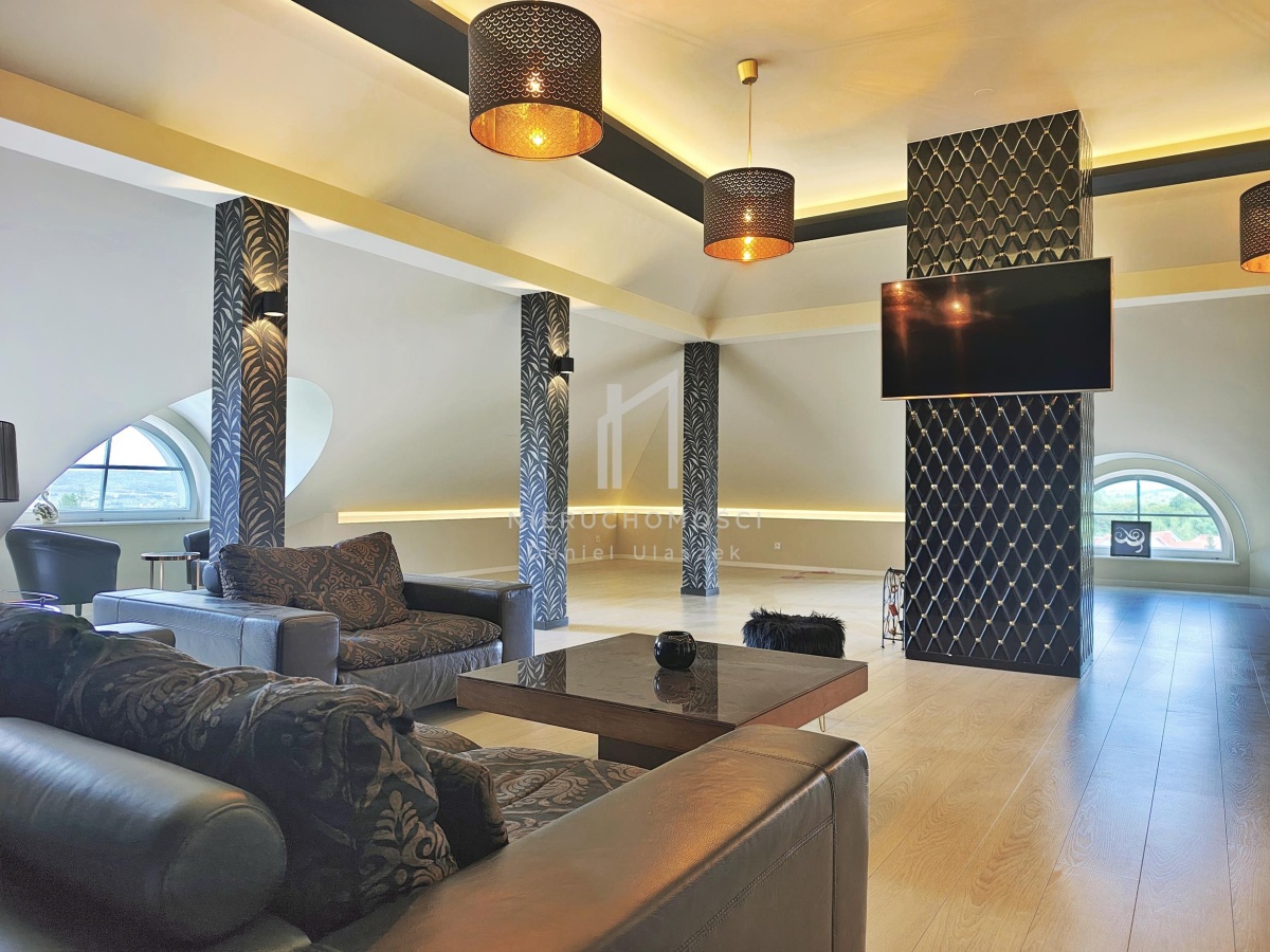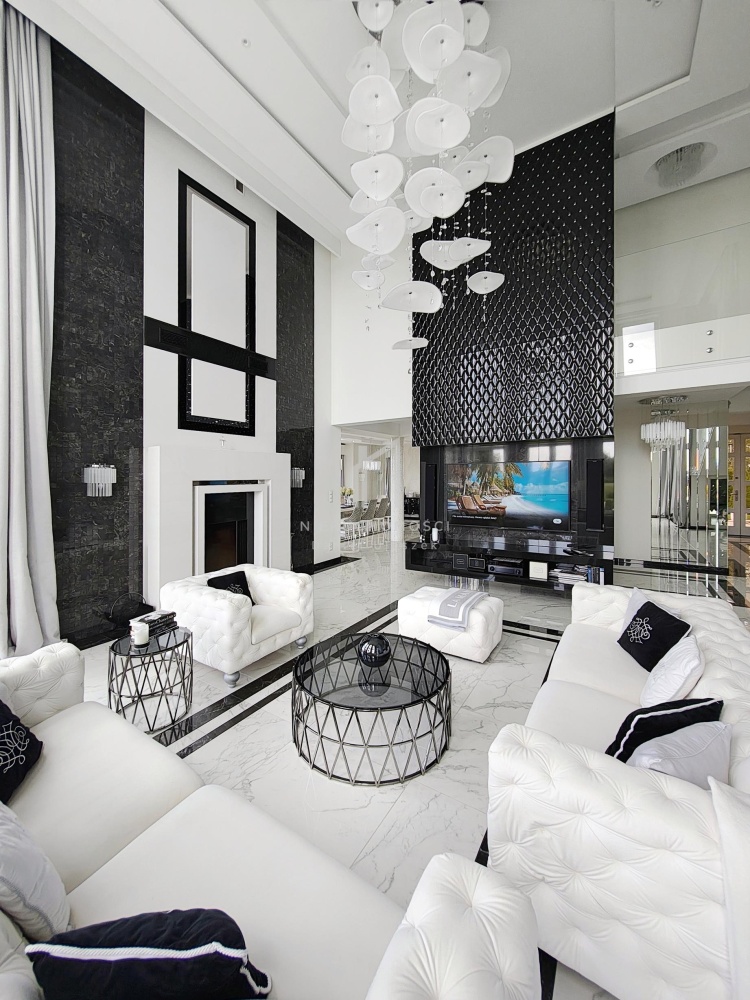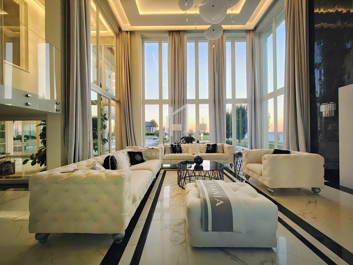 • przestronny salon z kominkiem i imponującym żyrandolem oraz wygodnym kompletem wypoczynkowym z włoskiego weluru, które w połączeniu z wysoką na 6 metry przestrzenią sufitową i panoramicznymi przeszkleniami w stylu francuskim wychodzącymi na ogród i taras - zapewnia niezwykłe doznania wizualne i przestrzenne,