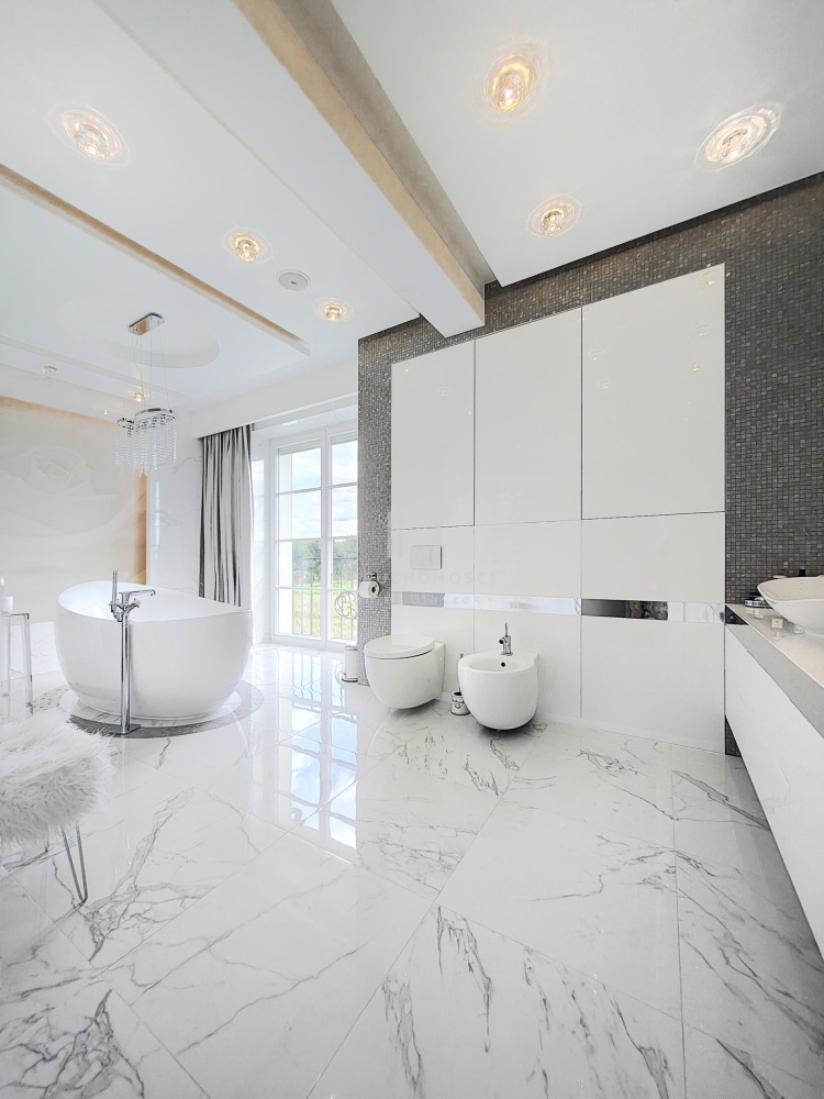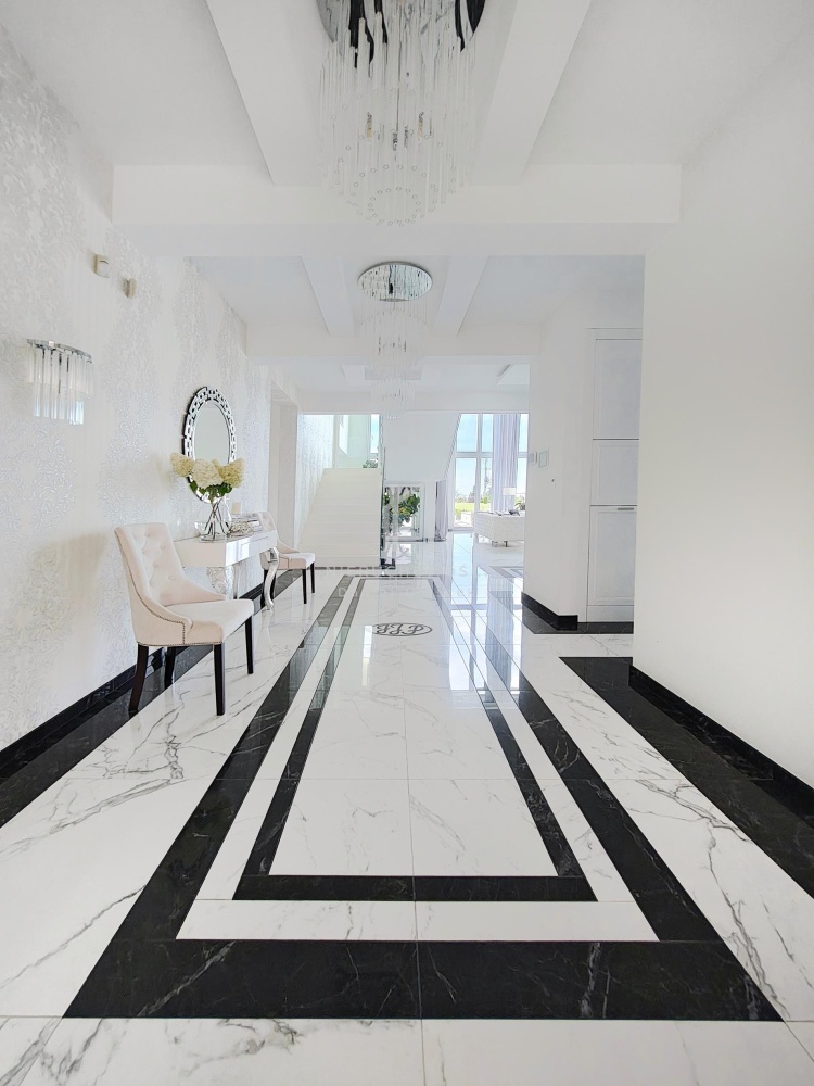- Wysokiej jakości wykończenia takie jak: naturalny kamień piaskowy na murkach wokół basenu, biały marmur, czarny granit, spiek kwarcowy na schodach, porcelanowe płytki, przeszklenia z filtrem UV;