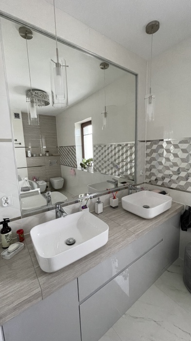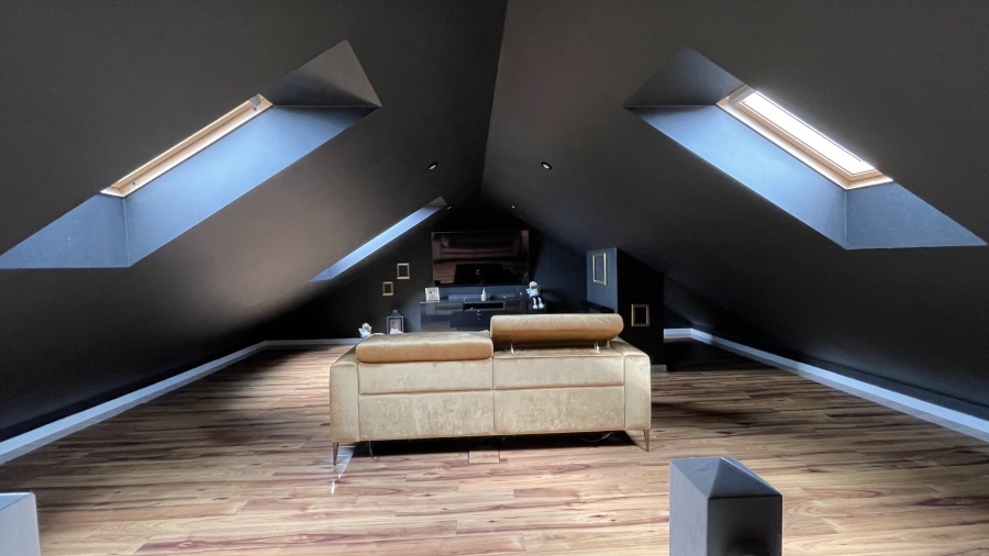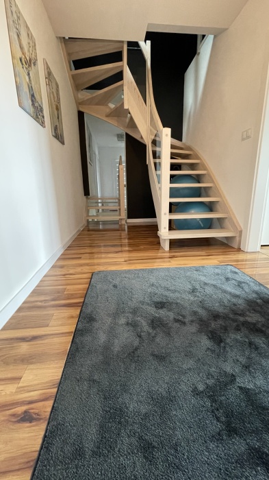 Są dwa wykończone poddasza, w jednym z nich znajduje się biokominek naścienny, oba mają uchylne okna dachowe, do tych najwyższych kondygnacji prowadzą wygodne schody w jasnym kolorze jesion które posiadają przeszklone balustrady.