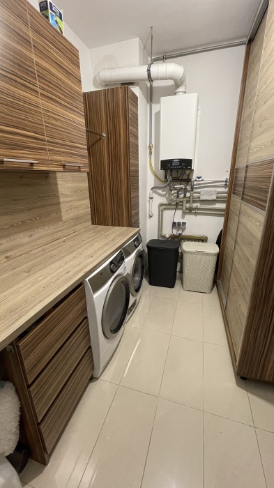 Dodatkowo zamontowana jest też terma do podgrzewania wody która czerpie energię z fotowoltaiki, więc w okresie letnim nie trzeba wykorzystywać gazu co przekłada się na oszczędności ekonomiczne. W domu znajdują jeszcze 2 klimatyzacje z opcjami jak w/w.