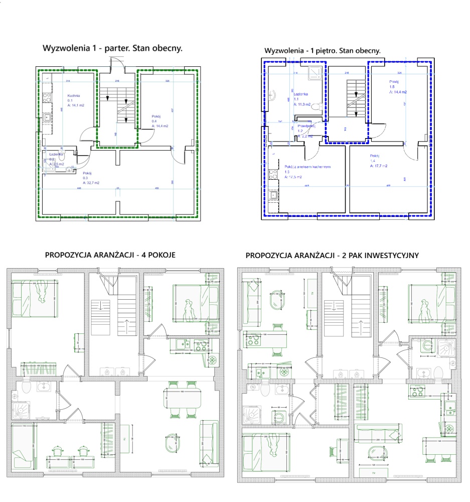 Możliwość zrobienia mieszkań 4 mieszkań dwu pokojowych po ok. 30-32m2 oraz dwóch kawalerek 18m2 z antresolami.