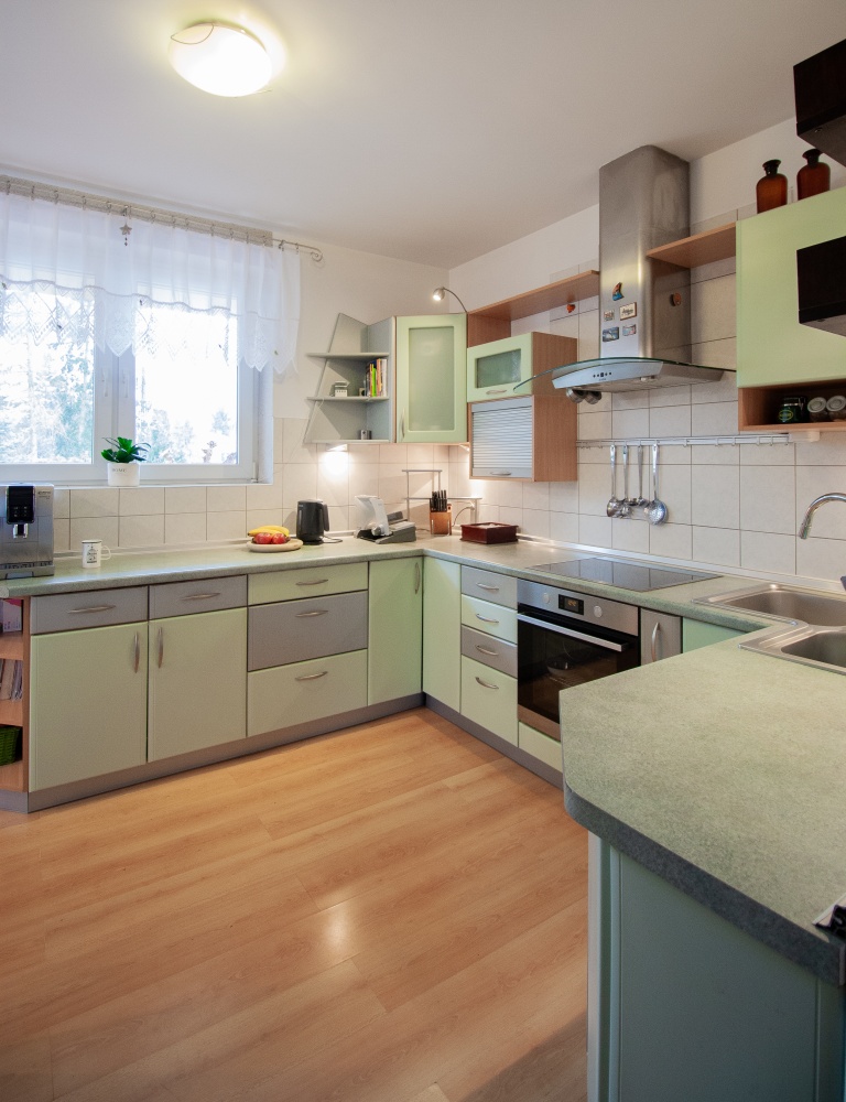 * Piwnica: duże pomieszczenie do aranżacji (np. pokój rozrywki, biuro), dodatkowa kuchnia, spiżarnia, kotłownia z piecem olejowym i zbiornikami paliwa (400 l) oraz bojlerem