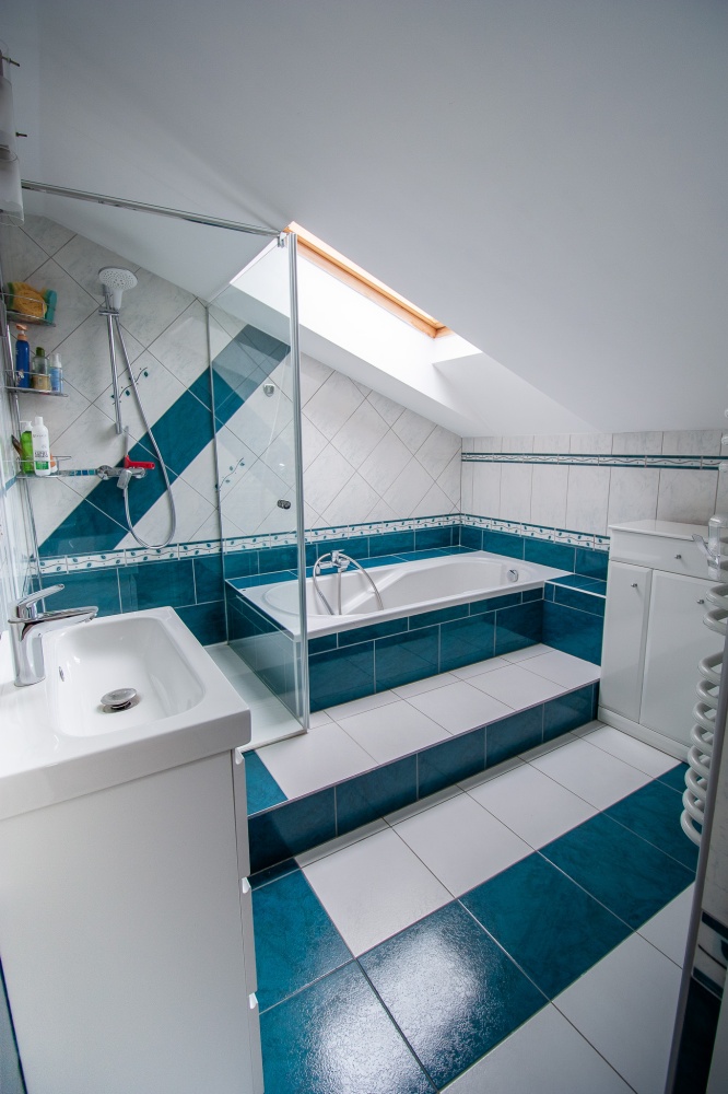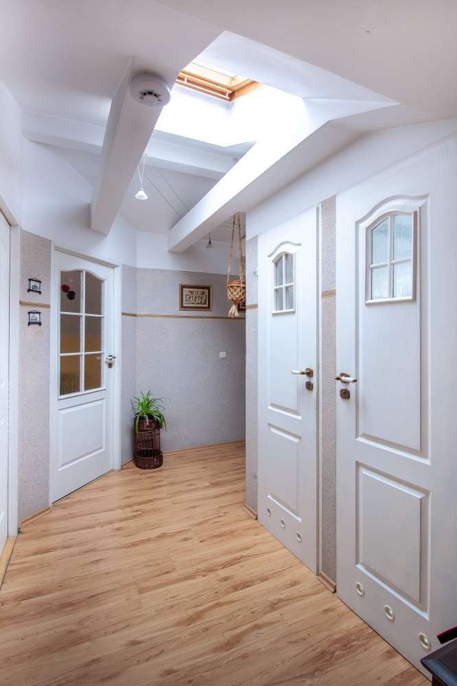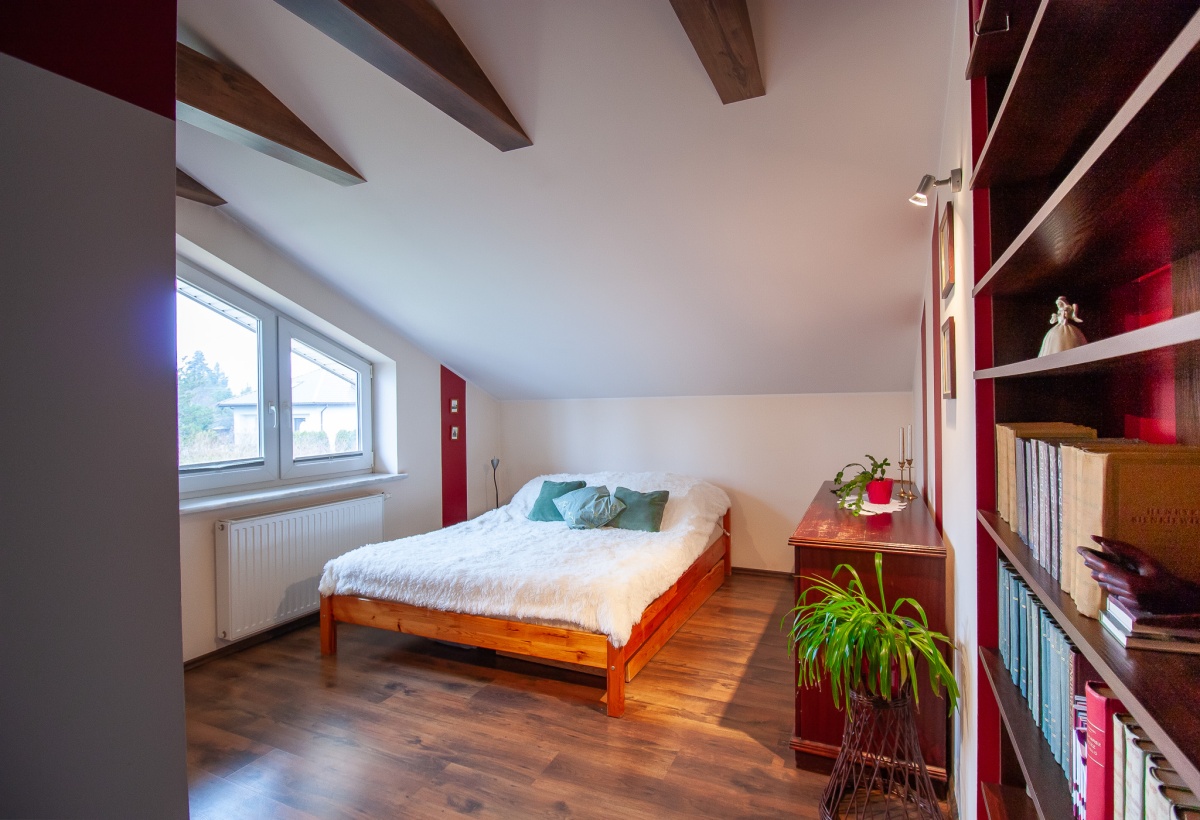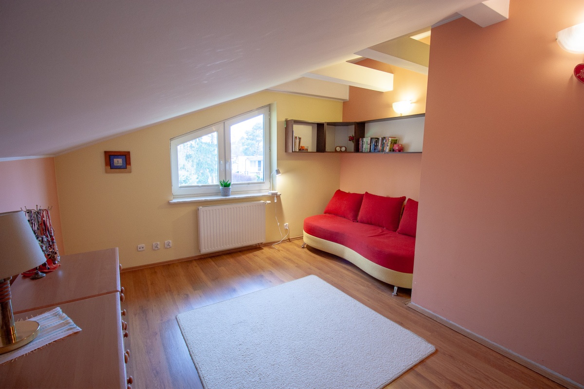 * Poddasze: 3 pokoje, garderoba na korytarzu, łazienka z wanną i prysznicem, osobna toaleta
