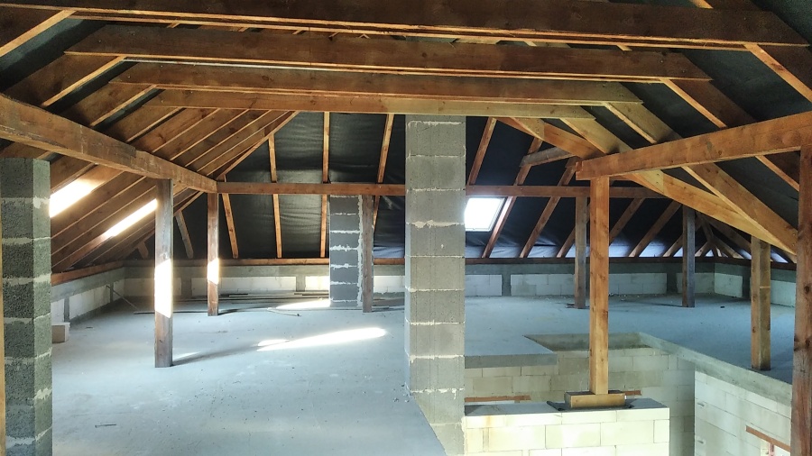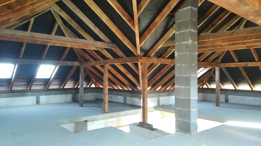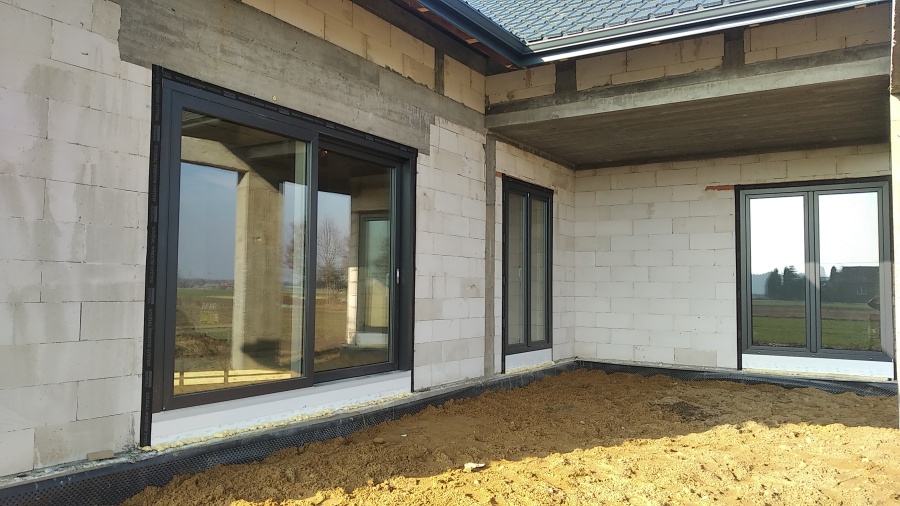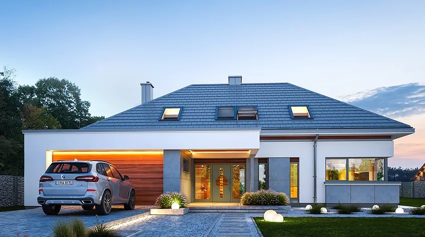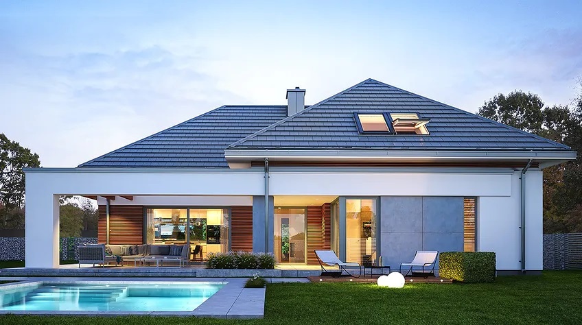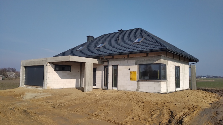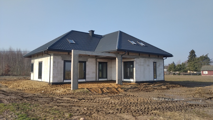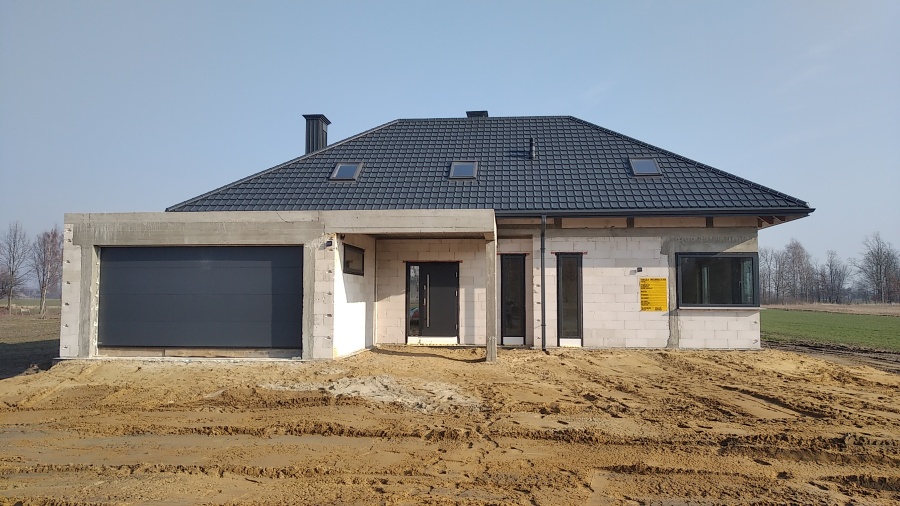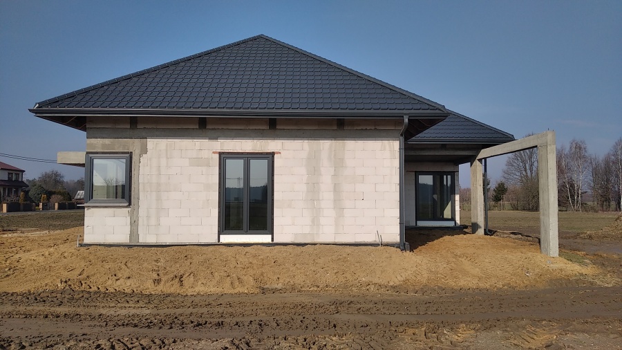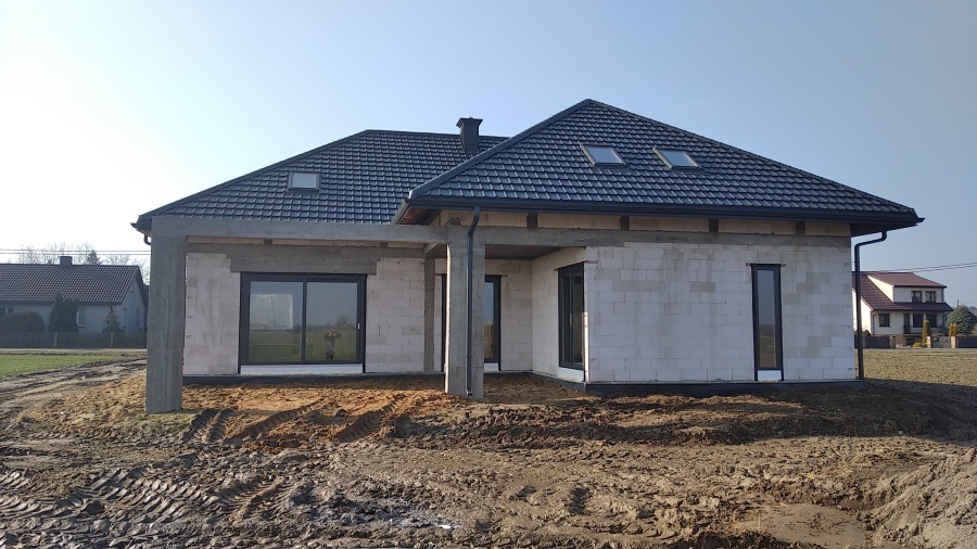 Dom zwieńczony jest wielospadowym dachem, pokryty blachodachówka firmy Pruszyński Fiord.