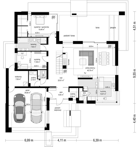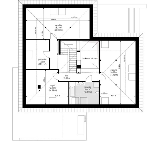 Okna najwyższej jakości trzyszybowe Veka. Architektura projektu jest nowoczesna i łączy w sobie tradycyjną bryłę ze spadzistym dachem z atrakcyjnym detalem architektonicznym. Bryłę domu zaplanowano na planie litery "T" - poddasze przekryte jest dachem w literę "L", a fragmenty zadaszenia nad garażem, podestem wejściowym i tarasem przykryto dodatkowymi płaskimi dachami. Duże okna otwierające wnętrze domostwa na ogród są niewątpliwie ozdobami budynku i podkreślają jego nowoczesny charakter. Wnętrze domu jednorodzinnego podzielono na część dzienną z otwartą przestrzenią salonu z otwarciem — pustką z antresolą na poddaszu, na część gospodarczą budynku — z garażem i pomieszczeniami gospodarczymi, oraz na dwie części sypialniane: na parterze i dodatkowym pokojem, z dwiema lub trzema sypialniami na poddaszu. Projekt domu jednorodzinnego to niewątpliwie willa dla osób lubiących nowoczesną architekturę.