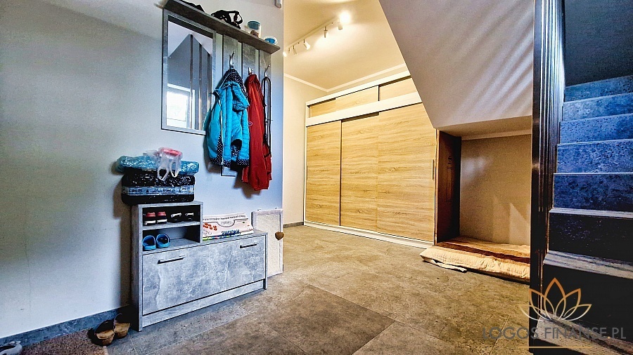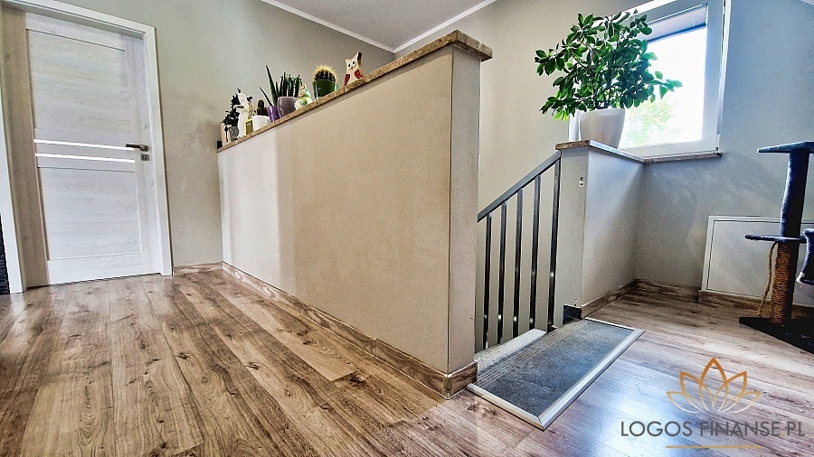 Działka gruntu zabudowana jest bardzo dobrze wykończonym budynkiem mieszkalnym, murowanym, dwukondygnacyjnym niepodpiwniczonym, z garażem wbudowanym, o powierzchni mieszkalnej 143,05 m2, garaż: 34,59m2 i kotłownia: 10,90m2.