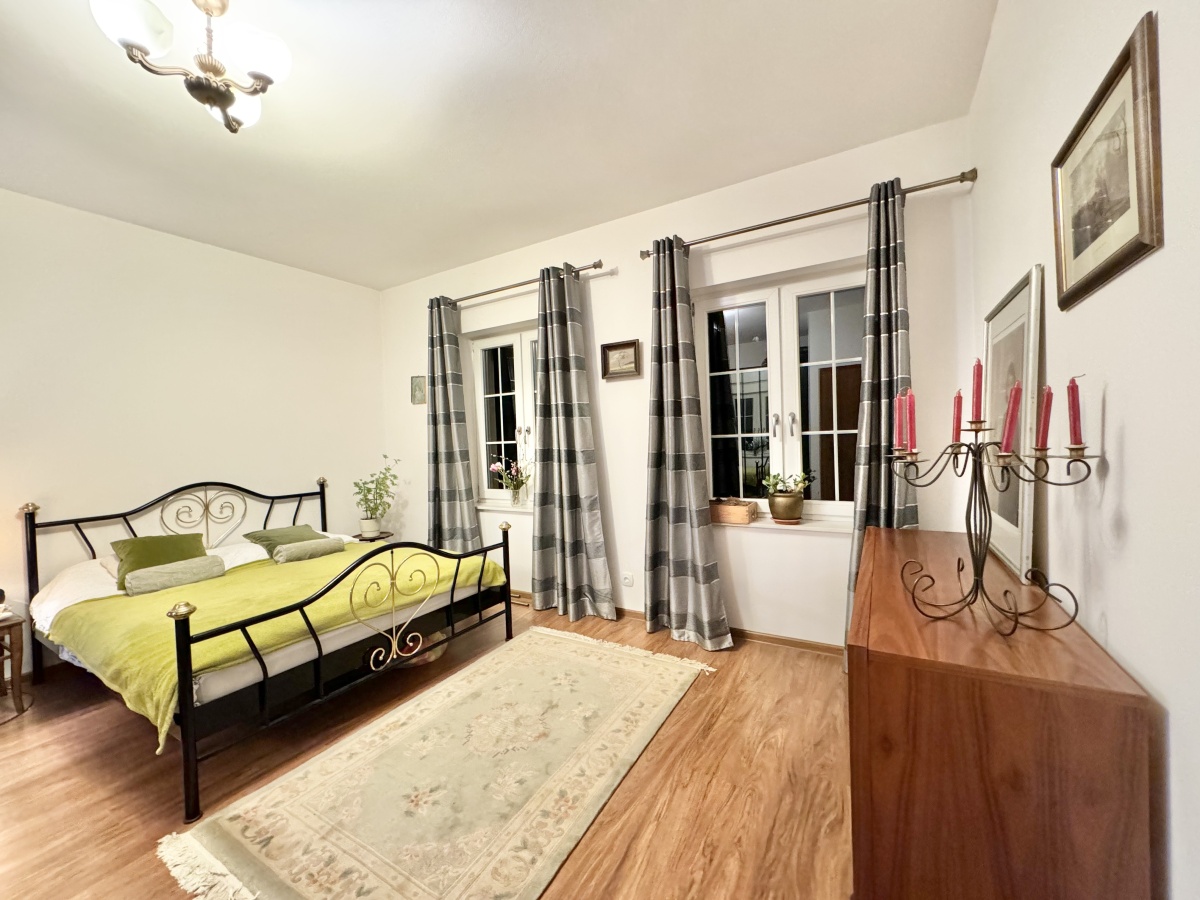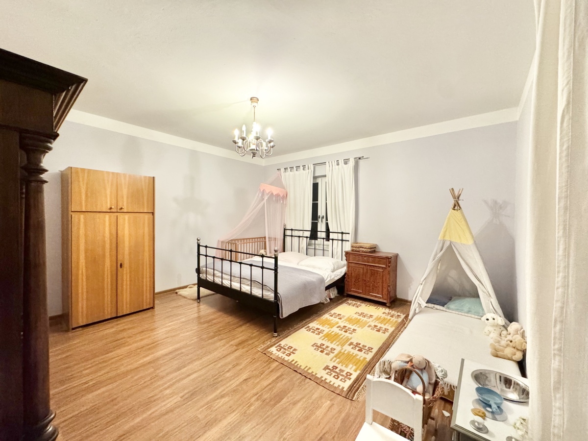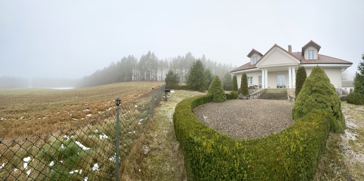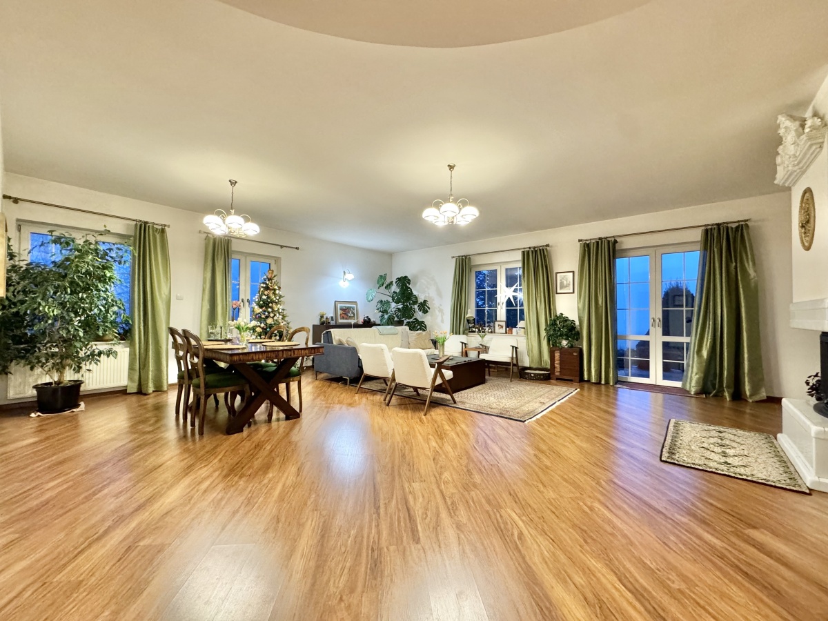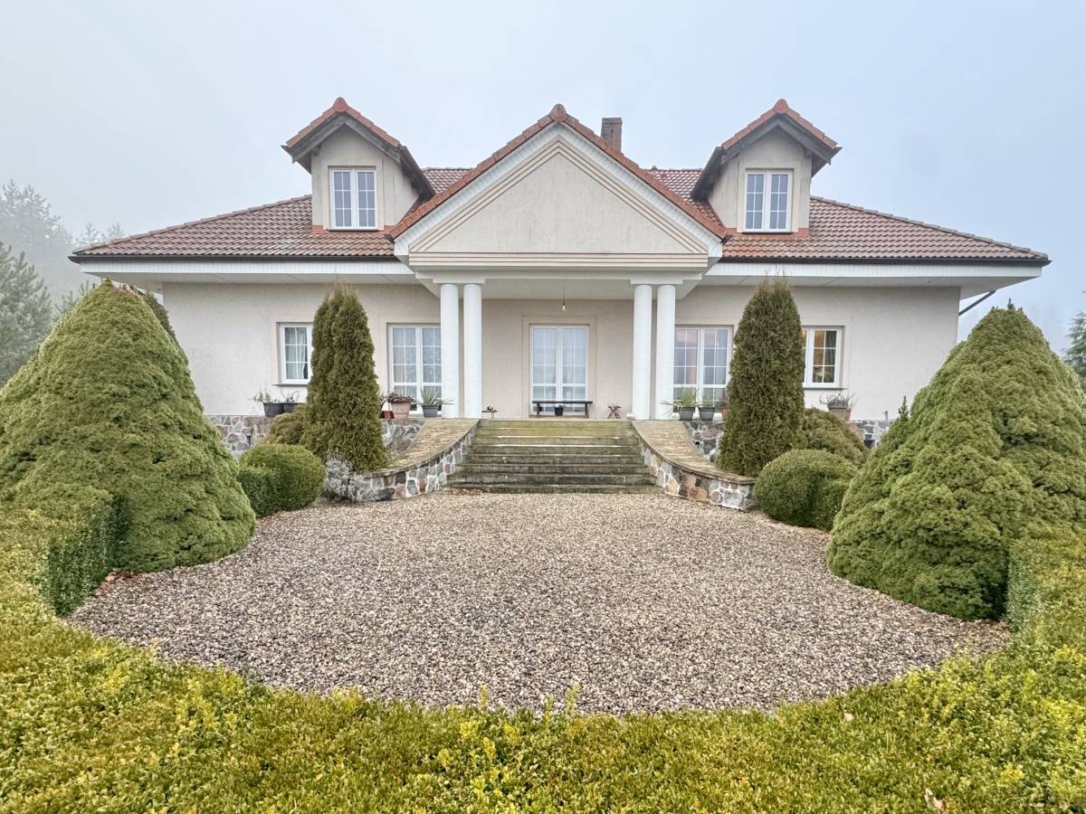 Na działce o powierzchni 5,6 ha znajduje się niezwykły dom zaprojektowany w dworskim stylu. Wykonany pod siebie z wysokiej jakości materiałów. Dom o łącznej powierzchni 450 m2, powierzchni użytkowej 300 m2, w tym gotowej do zamieszkania i pięknie zaaranżowanej powierzchni 150 m2. Przestrzeń gotowa do zamieszkania, to parter domu, gdzie znajduje się salon z kominkiem i wyjściem na ogród, wydzielona i jednocześnie otwarta kuchnia, 3 duże sypialnie, spiżarnia, łazienka, toaleta oraz hol. Na poddaszu część do własnej aranżacji z oknami połaciowymi oraz standardowymi, przyłącza do wykonania łazienki oraz grzejniki. Część podpiwniczenia obecnie stanowi kotłownia z piecem na ekogroszek, pralnia, spiżarnia oraz 3 pomieszczenia do własnej aranżacji, przy czym jedno z nich o powierzchni aż 42 m2.