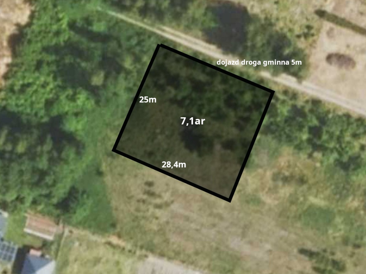 Działka o pow. 7,1 ar o wymiarach 28,4m x 25m, płaska o kształcie prostokąta. Na działkę zostały wydane warunki zabudowy na dom jednorodzinny.