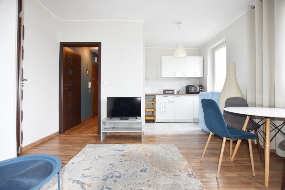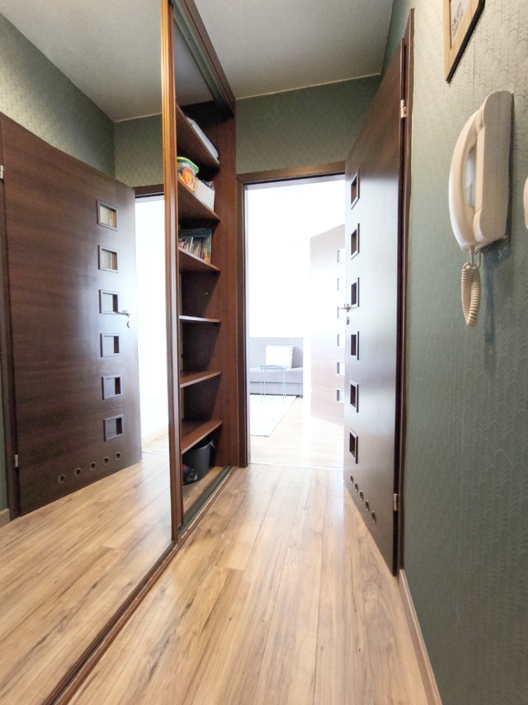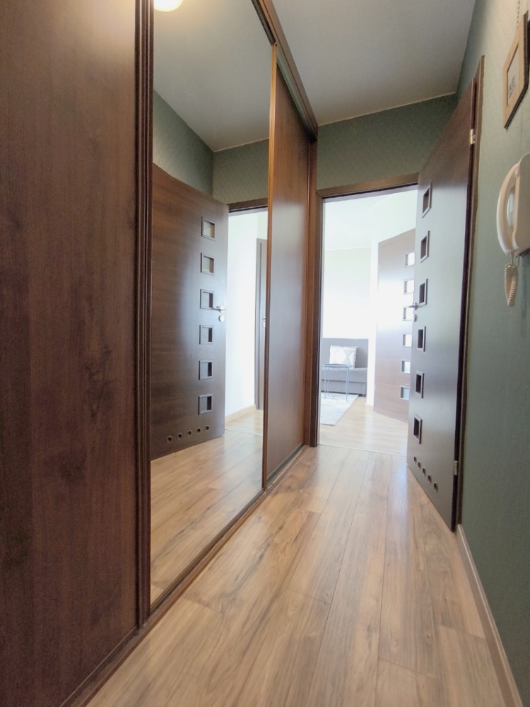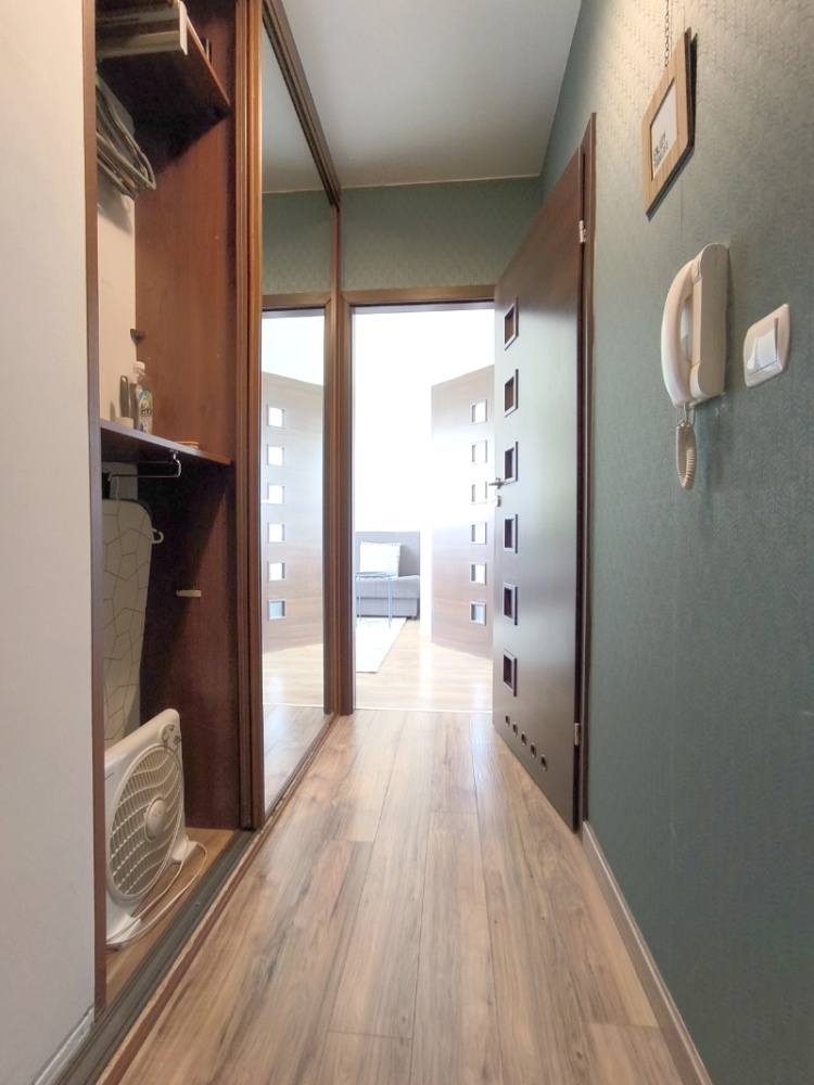 Komfortowe mieszkanie o powierzchni 30m2, na które składa się salon z aneksem kuchennym, łazienka z wc, oddzielna sypialnia oraz przedpokój z bardzo dużą szafą w zabudowie stolarskiej. W szafie znajduje się pantograf, oddzielne zamykane półki na obuwie, drążek na rzeczy wiszące oraz dużo półek. Szafa ma ponad 3m szerokości.