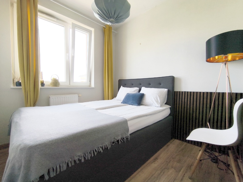 W sypialni bardzo wygodne, nowe łóżko kontynentalne o wymiarach 140/200 cm.