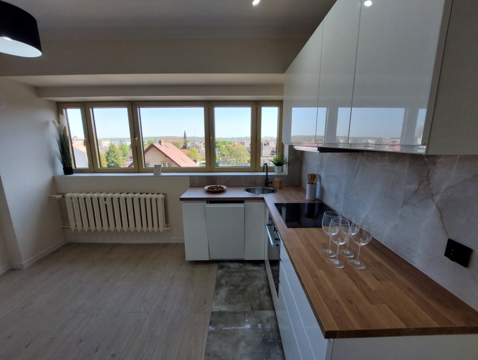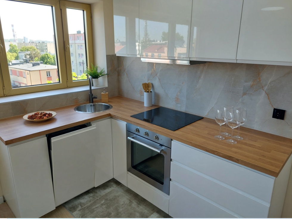 - nowa zabudowa kuchni wraz ze sprzętem AGD – piekarnik, zmywarka, płyta elektryczna, okap, lodówka (na gwarancji),