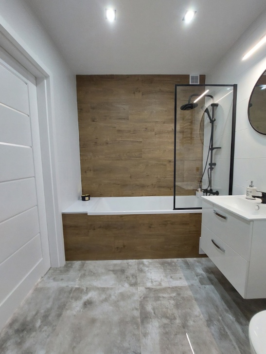 - na podłogach w pokojach ułożono panele (AC4, V – fuga) wraz z listwami przypodłogowymi oraz wiele innych.