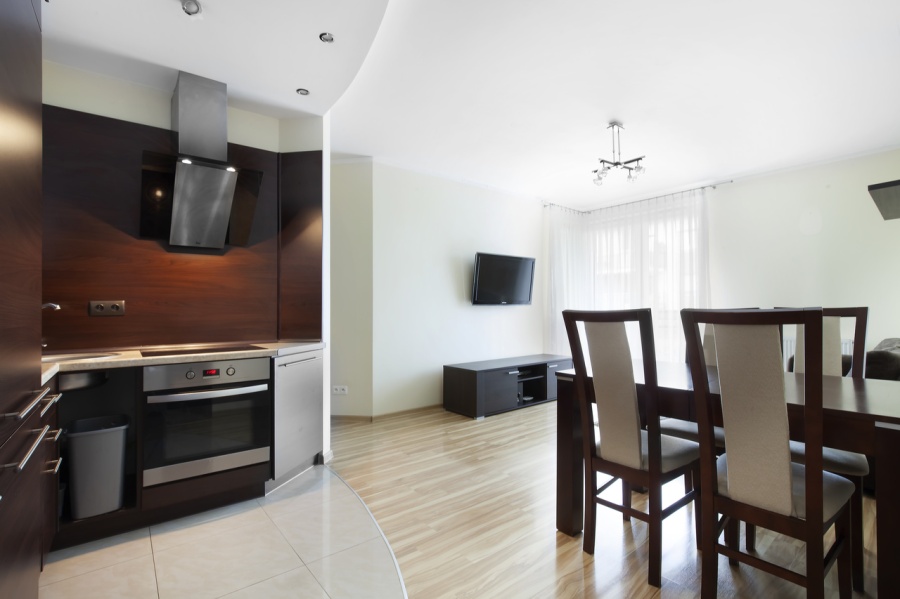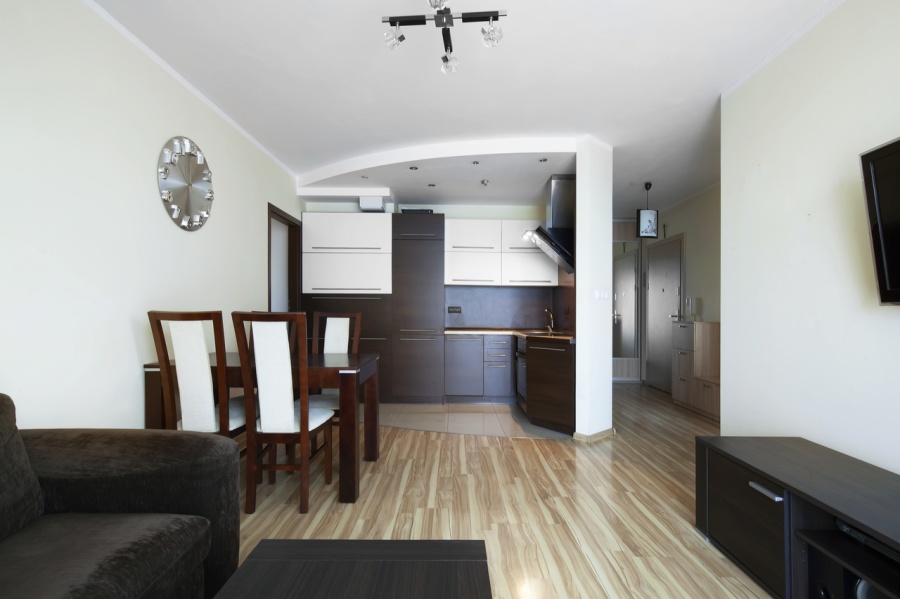 ♦ przestronny i jasny pokój dzienny (21,95 m2) wraz z aneksem kuchennym z wyjściem na słoneczny balkon (10m2),