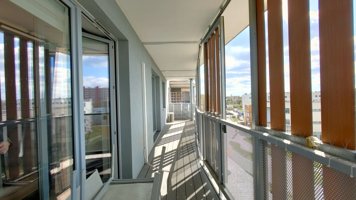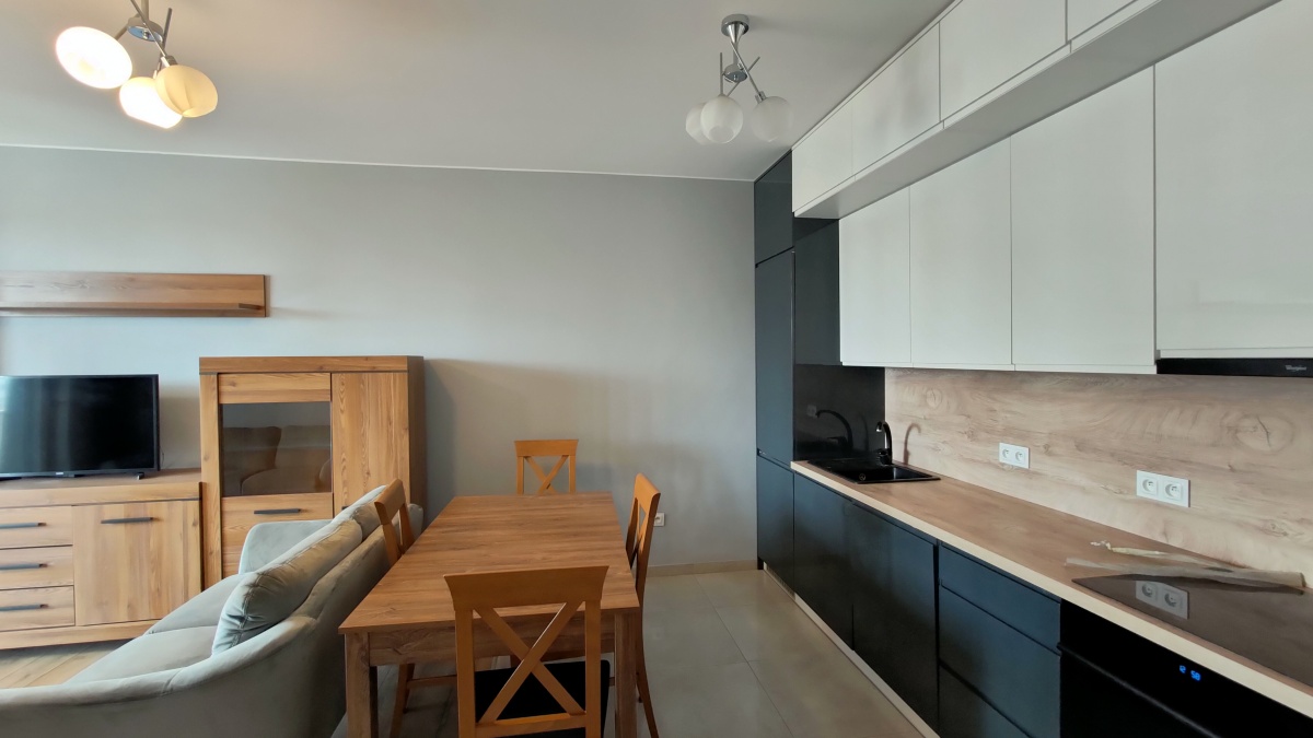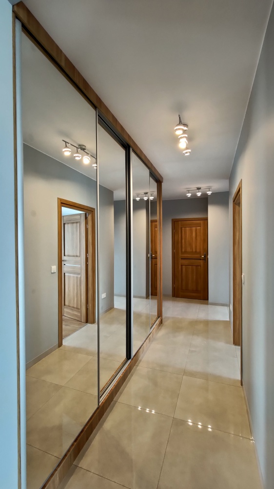 61m2 - 2 sypialnie, każda z dużą zabudowaną szafą, salon z kuchnią i wyjściem na ogromny balkon, przedpokój z wielką zabudowaną szafą, bardzo duża łazienka z kabina prysznicową i WC.