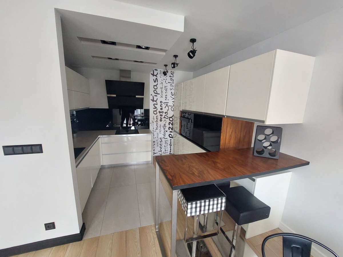 Kuchnia zabudowana szafkami, sprzętem AGD tj. lodówką, płytą grzejną elektryczną, okapem,