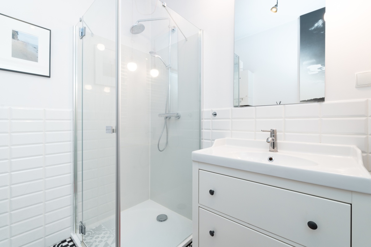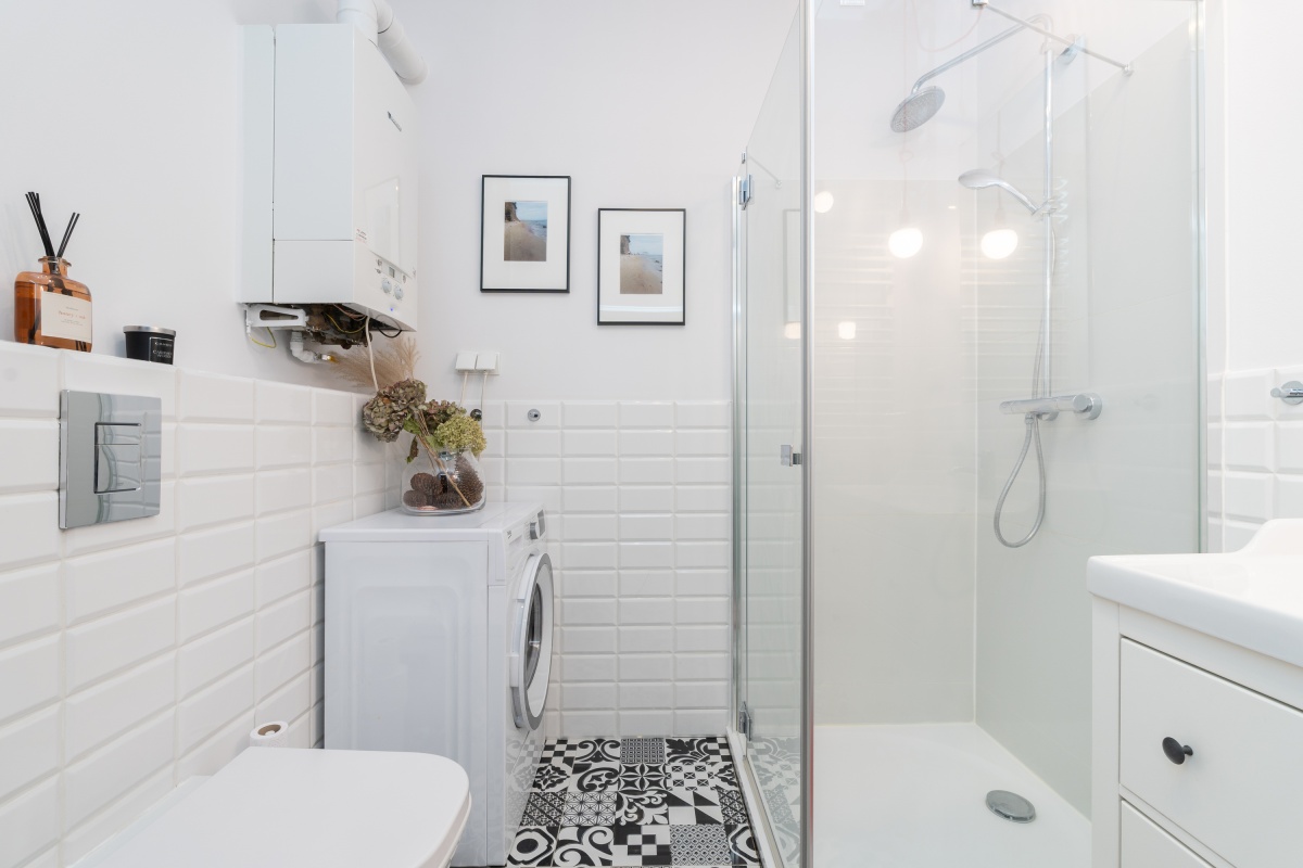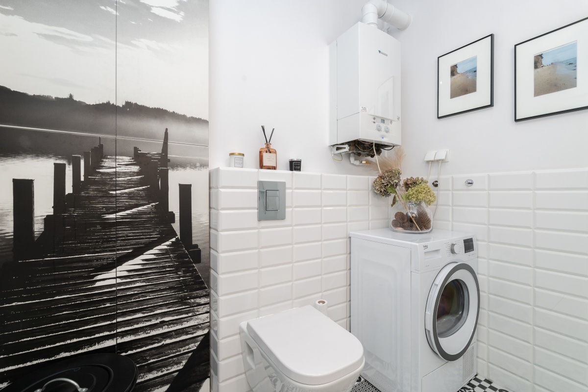 -łazienka z wc (5,13m2) wyposażona w kabinę prysznicową, pralkę umieszczoną w zabudowie oraz suszarkę;