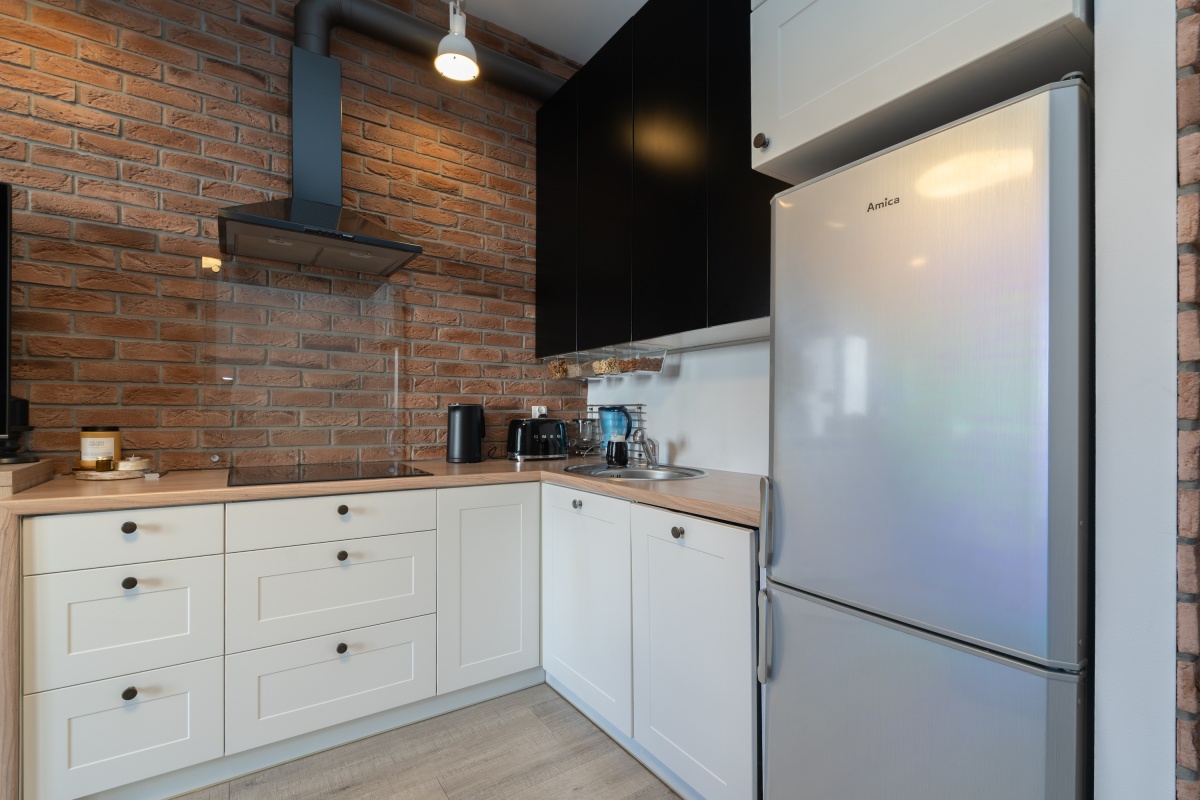 *cześć kuchenna w pełni wyposażona, zawiera lodówkę, zmywarkę, kuchenkę mikrofalową, okap oraz płytę grzewczą;