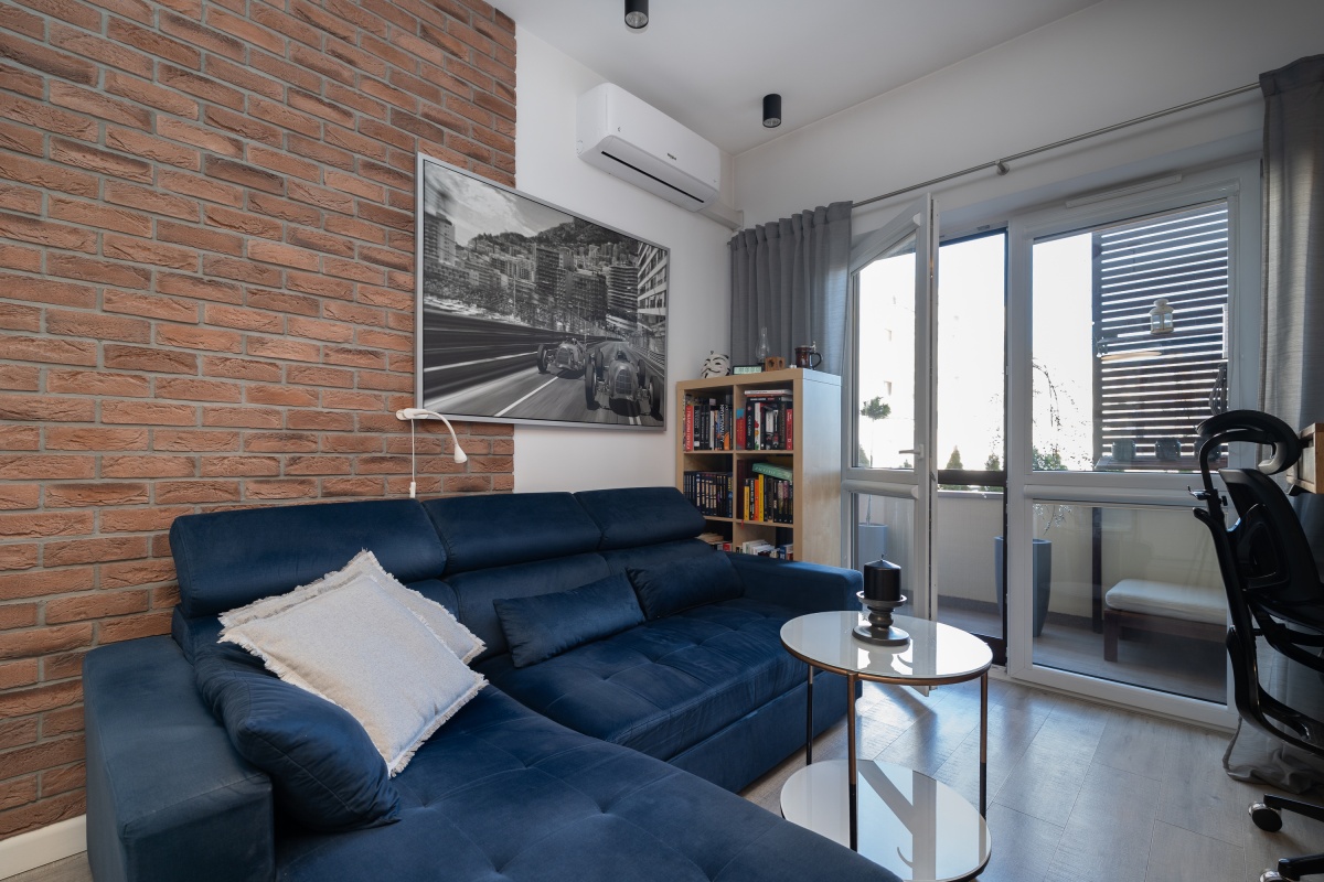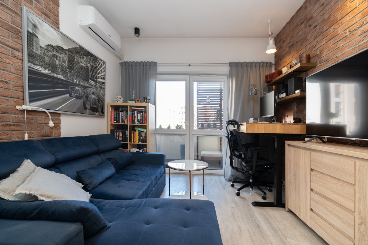 *część wypoczynkowa wyposażona w sofę, stolik kawowy oraz szafkę RTV