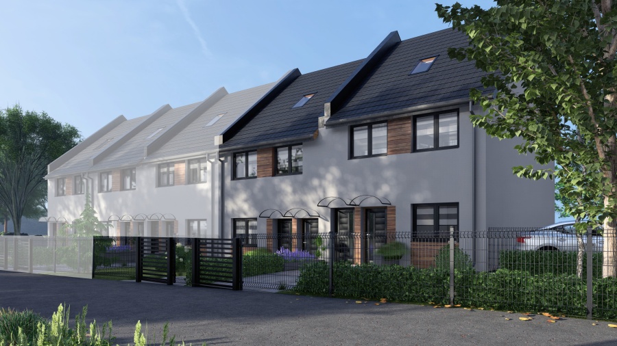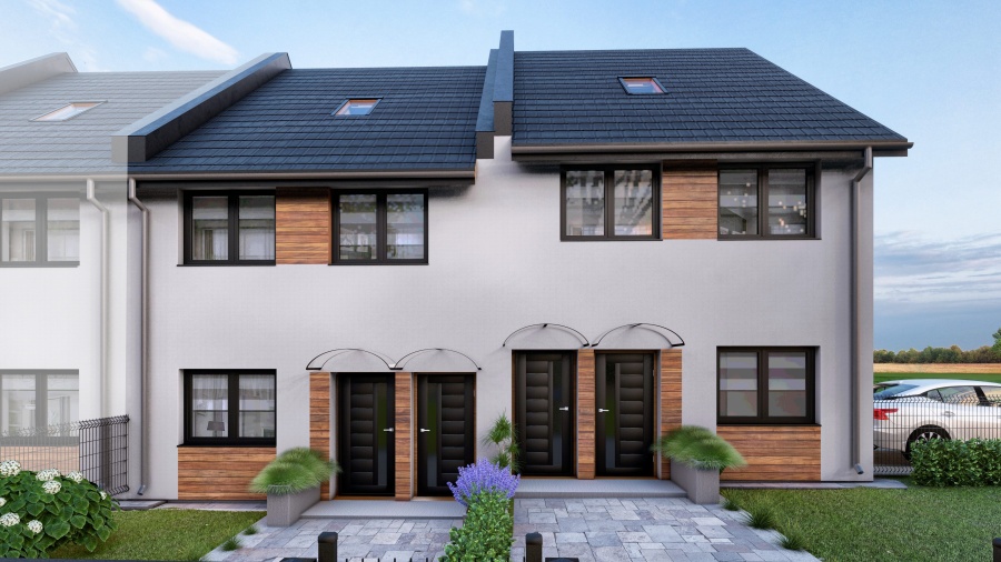 • Kolorystyka elewacji zgodna z wizualizacjami: jasny szary tynk oraz deski PVC,