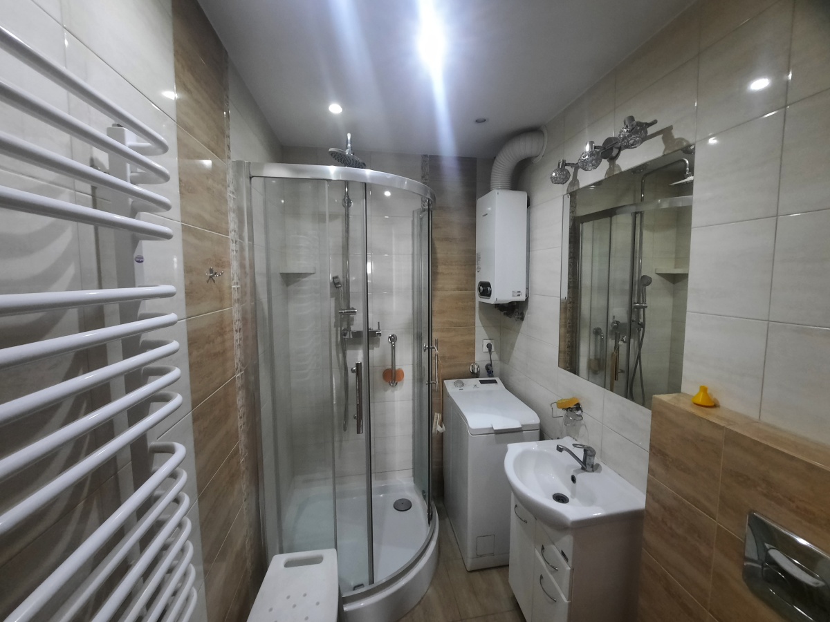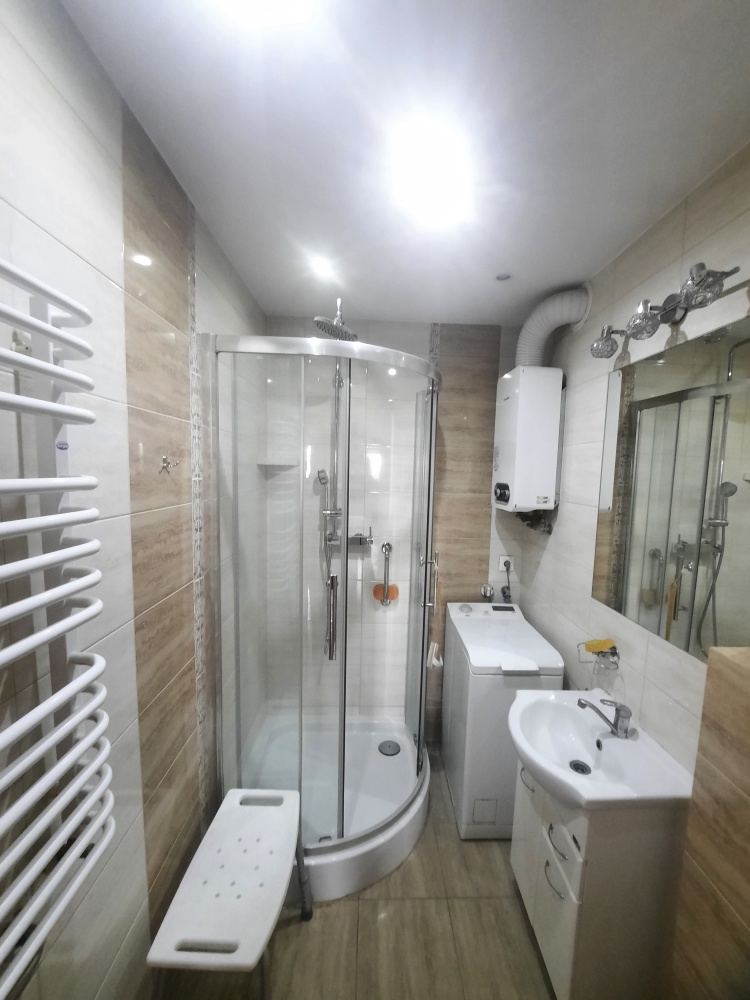 W łazience wymienione zostały częściowo instalacje, na ścianach i podłodze położone są płytki ceramiczne, wanna została wymieniona na kabinę prysznicową. Ciepła woda z piecyka gazowego.