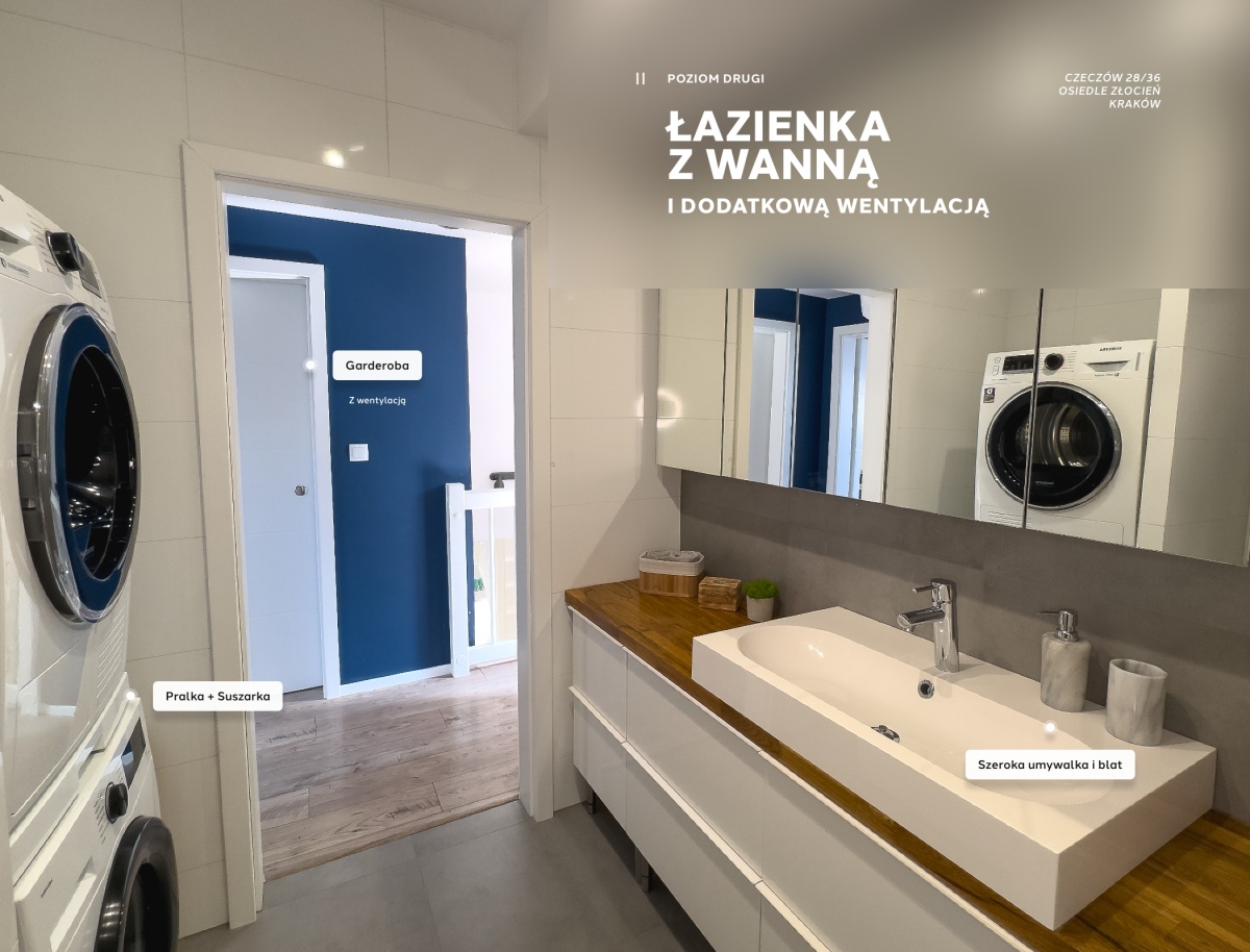 Poziom drugi: pokój przechodni, duża łazienka z wanną, garderoba, główna sypialnia