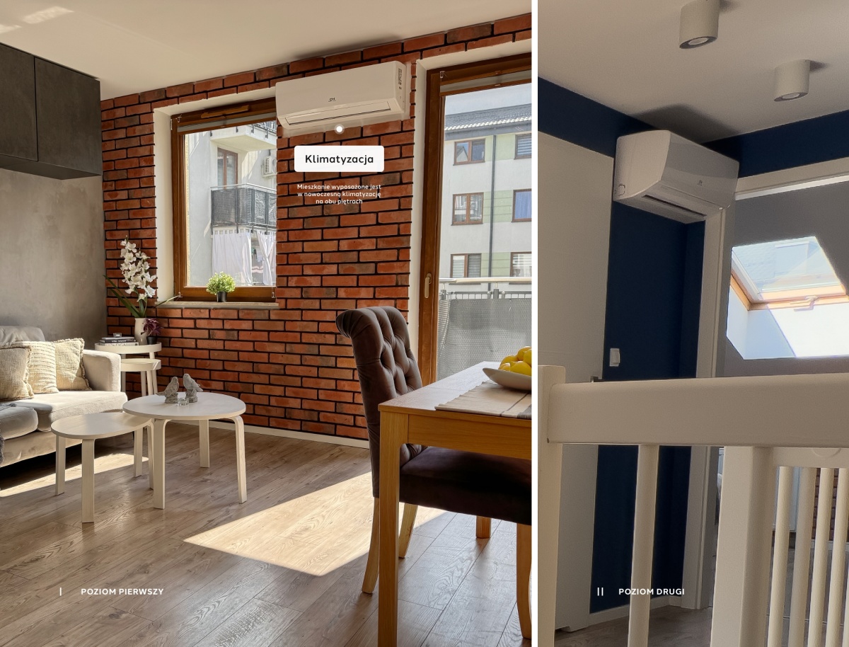 Mieszkanie wyposażone jest w nowoczesną klimatyzację na obydwu piętrach, zapewniającą doskonałe warunki mieszkaniowe przez cały rok. Wydajny system klimatyzacyjny pozwala na skuteczne schłodzenie mieszkania w gorące letnie dni oraz stanowi doskonałe uzupełnienie ogrzewania w okresie zimowym. To rozwiązanie gwarantuje komfort termiczny niezależnie od pory roku i warunków atmosferycznych.