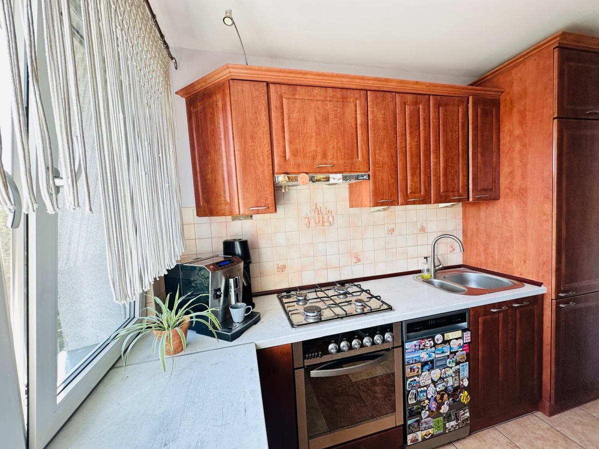 - Przestronna kuchnia otwarta na korytarz, chłodziarko-zamrażarka, piekarnik (elektryczny), płyta gazowa i pochłaniacz w zabudowie, zmywarka wolnostojąca, zlew 1,5-komorowy,