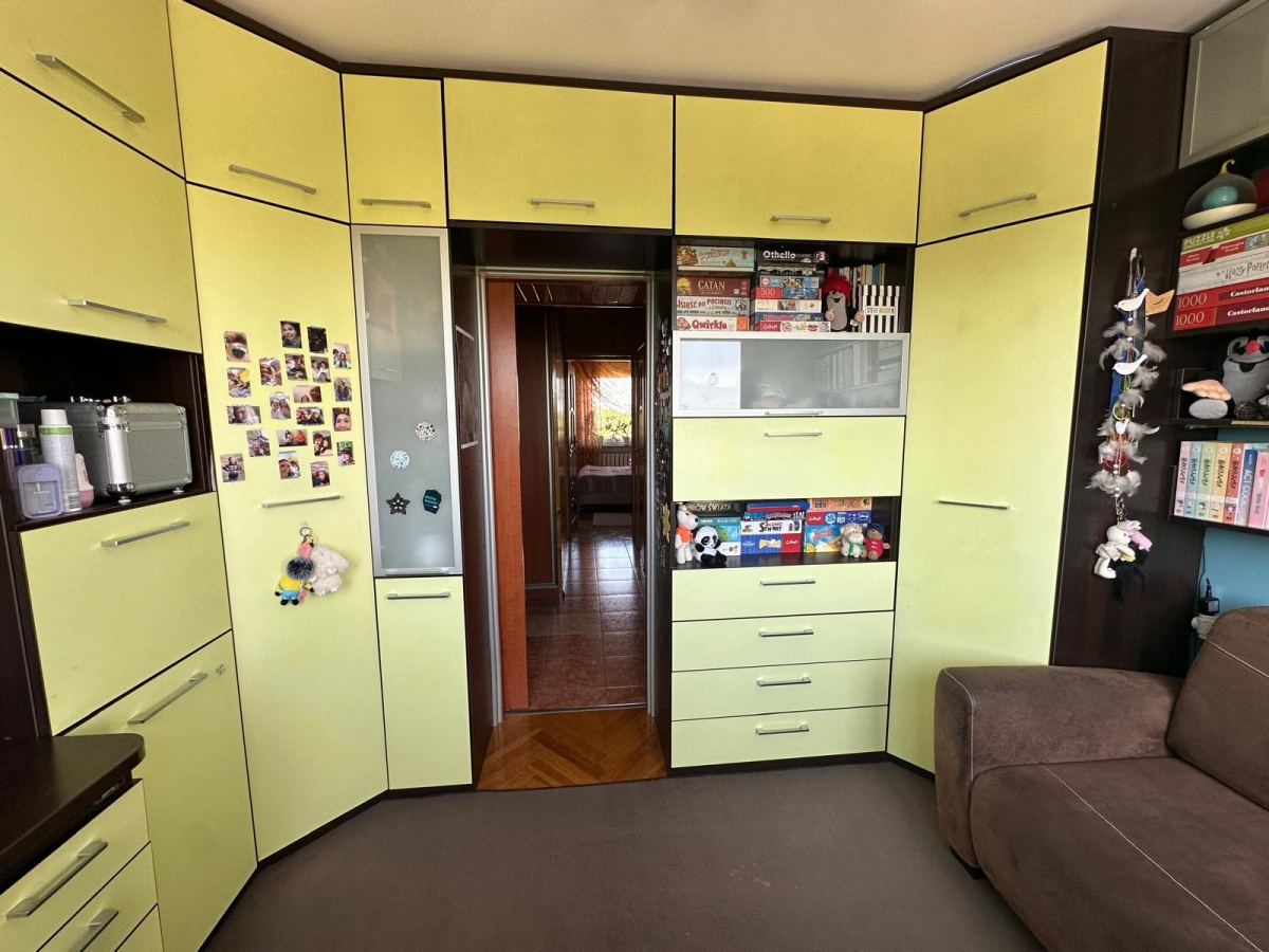 - w przedpokoju naturalna sosnowa boazeria, szafa narożna z dużym lustrem w zabudowie i szafka wolnostojąca na obuwie, w korytarzu dwie duże szafy przesuwne w zabudowie oraz dwa pojemne pawlacze na „przydasie”;