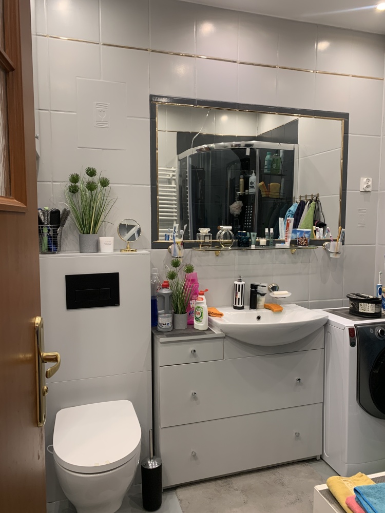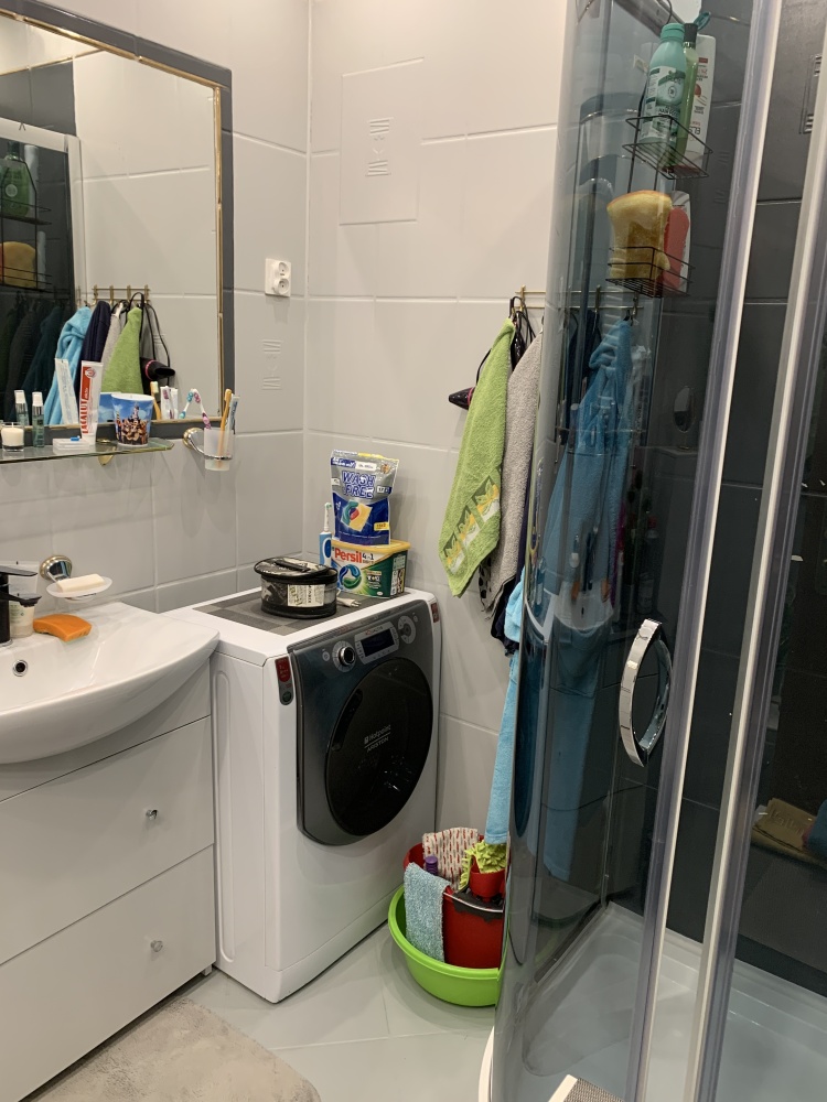 Łazienka z WC - kabina prysznicowa, umywalka, misa WC, miejsce pod pralkę, wisząca szafka