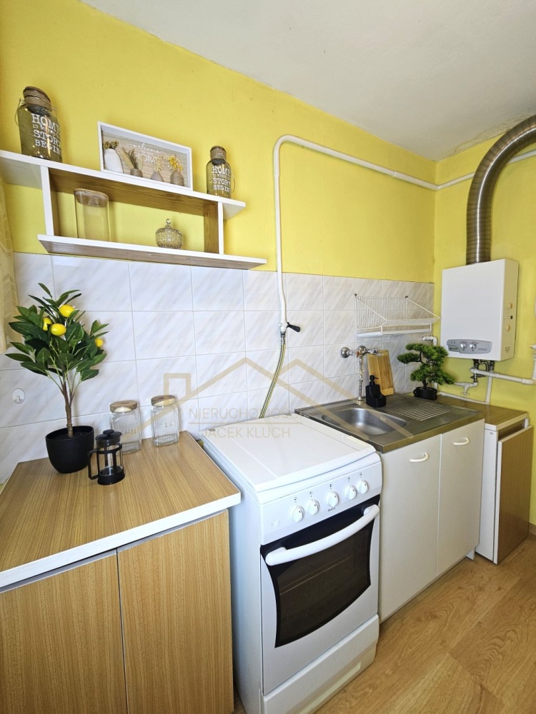 - kuchnia z oknem wyposażona w meble kuchenne oraz sprzęt AGD ( kuchenka gazowa, lodówka)