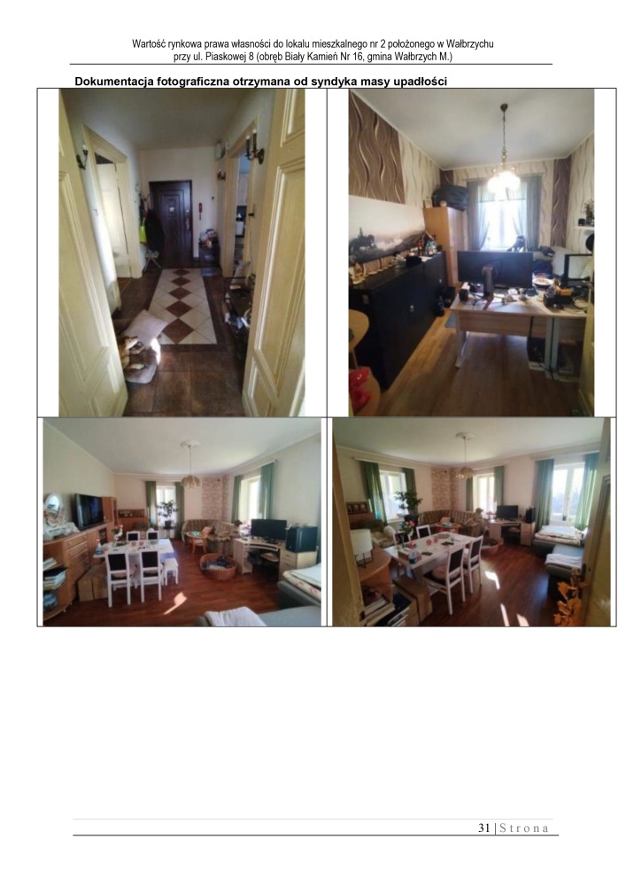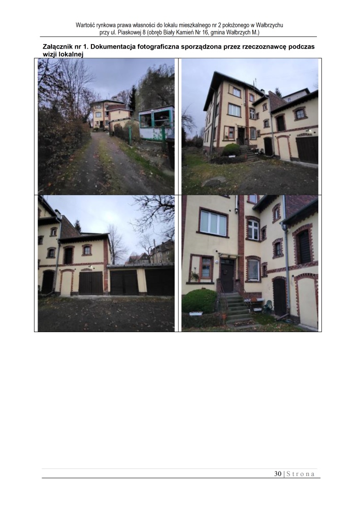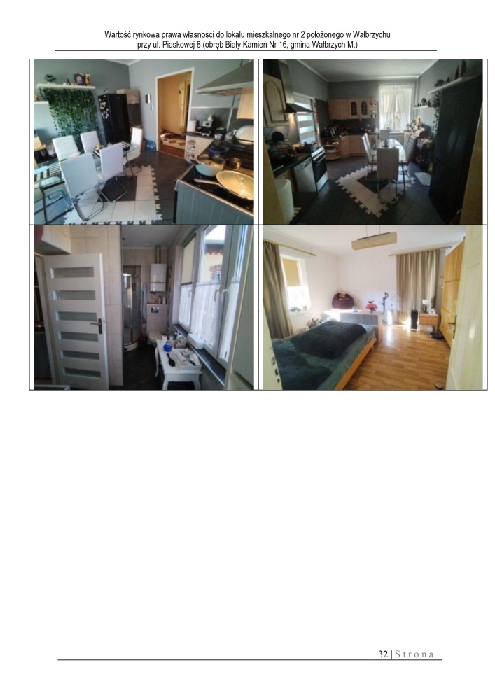 Lokal mieszkalny położony na 2 kondygnacji budynku w Wałbrzychu przy ul. Piaskowej 8. Powierzchnia użytkowa wycenianego lokalu wynosi: 87,32 m2.
