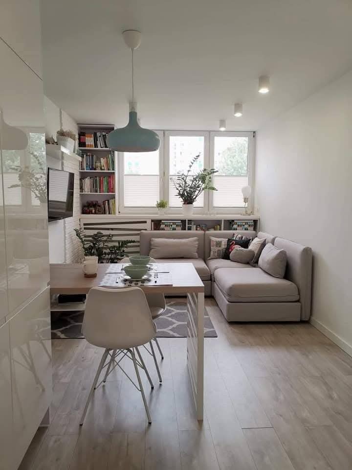 SALON: w salonie znajduje się wygodny narożnik, stolik kawowy, telewizor, stół oraz krzesła. Przestrzeń pod parapetami została wykorzystana na dodatkowe miejsce do przechowywania.