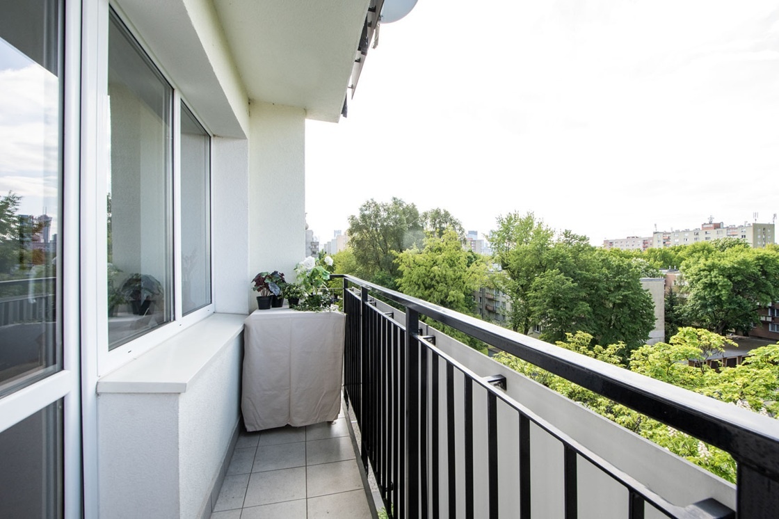 * Balkon z widokiem na zieleń.