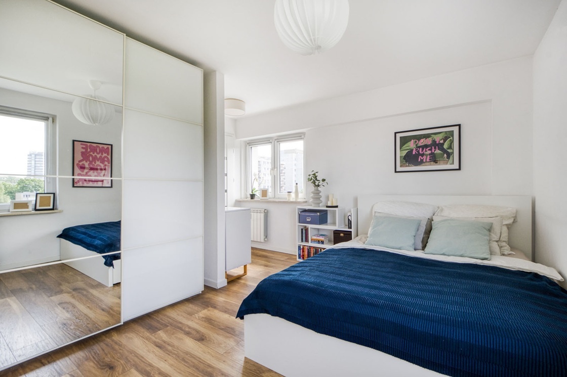 * Sypialnia (ok. 13,5 m²) z dodatkowym pomieszczeniem gospodarczym (2,5 m²) – idealne na pralnię.