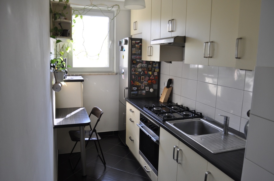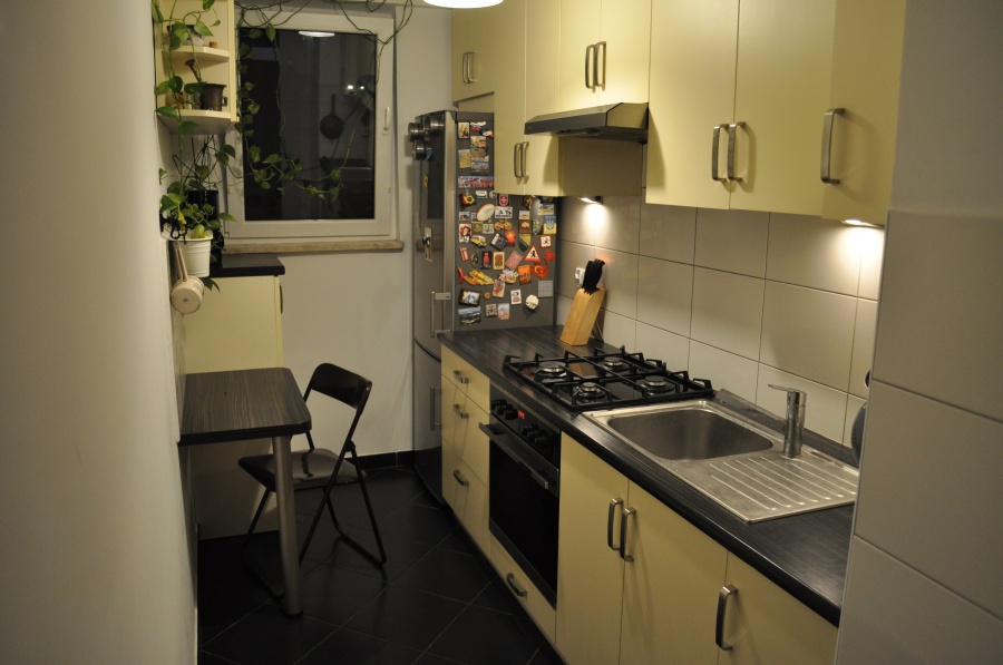 Wyposażenie: szafa wnękowa, szafki w kuchni robione na zamówienie, płyta gazowa, piekarnik, ew. lodówka, szafa z lustrami na ubrania.