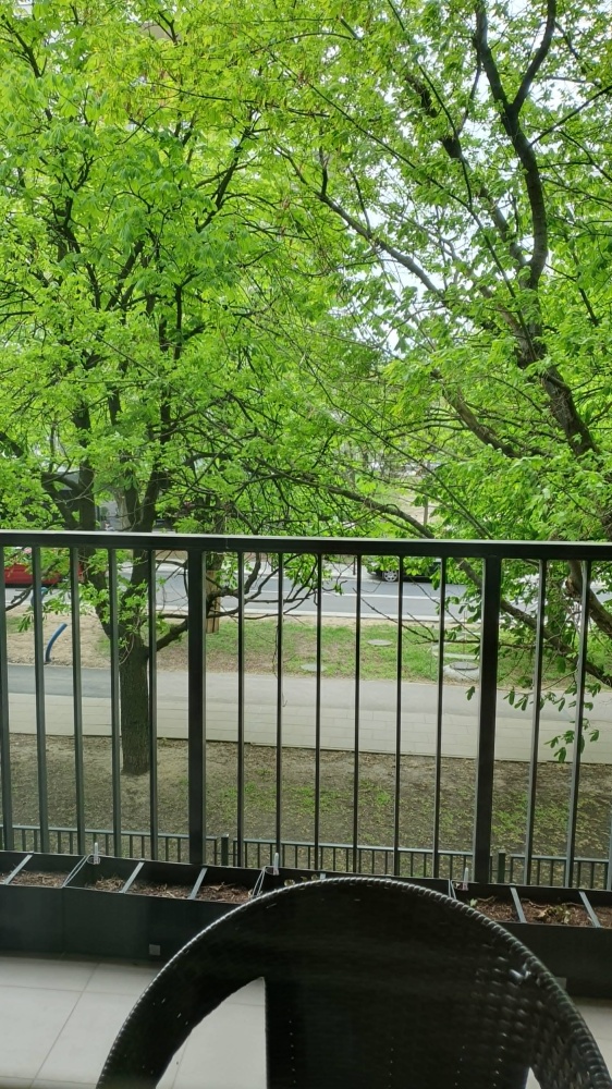 Apartament posiada duże okna wychodzące na osiedle, oraz balkon z widokiem na ulice.