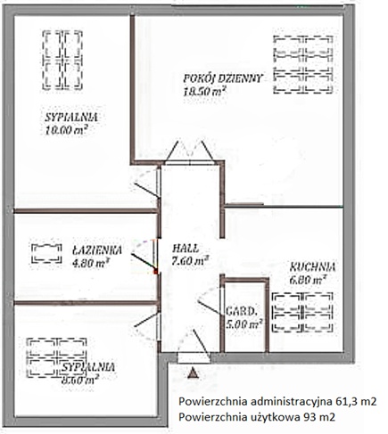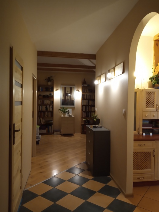 Powierzchnia mieszkania wynosi 61,3 m2 w rzeczywistości licząc po podłodze w użytkowaniu jest 93 m2. Mieszkanie jest dwustronne: wschód (salon i kuchnia) oraz zachód (sypialnie i łazienka. Na podłogach w pokojach leżą panele, w przedpokoju i kuchni - terakota. Łazienka z oknem wykończona glazurą i terakotą wyposażona w wannę.