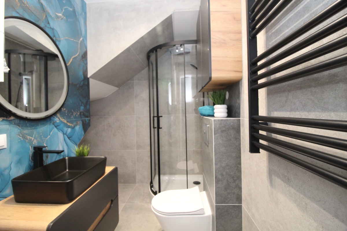 Ściany pokryte gładzią i malowane natryskowo, schody wewnętrzne wysokiej jakości odporny konglomerat , panele wysokiej klasy, ogrzewanie podłogowe w całym mieszkaniu, futryny i drzwi wysokiej klasy, zabudowany piec gazowy meblami na wymiar, wideodomofon, instalacja alarmowa i światłowodowa- dokładny standard wykończenia podajemy przy prezentacji.