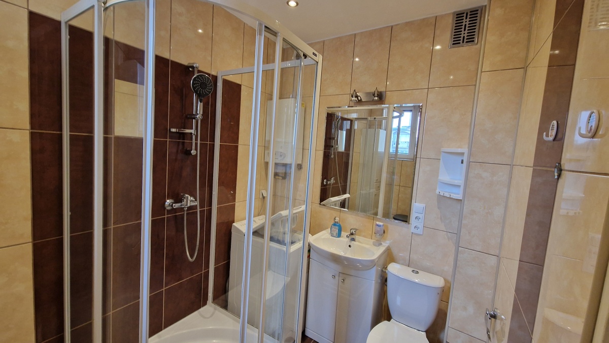 W pokoju znajduje się zestaw mebli z dużą pojemną szafą, rozkładana 2-osobowa sofa , ława, fotele. Kuchnia umeblowana, wyposażona w kuchenkę gazowa, lodówkę, czajnik elektryczny i kuchenkę mikrofalową. Dodatkowo: żelazko, mała deska do prasowania, odkurzacz, pralka.