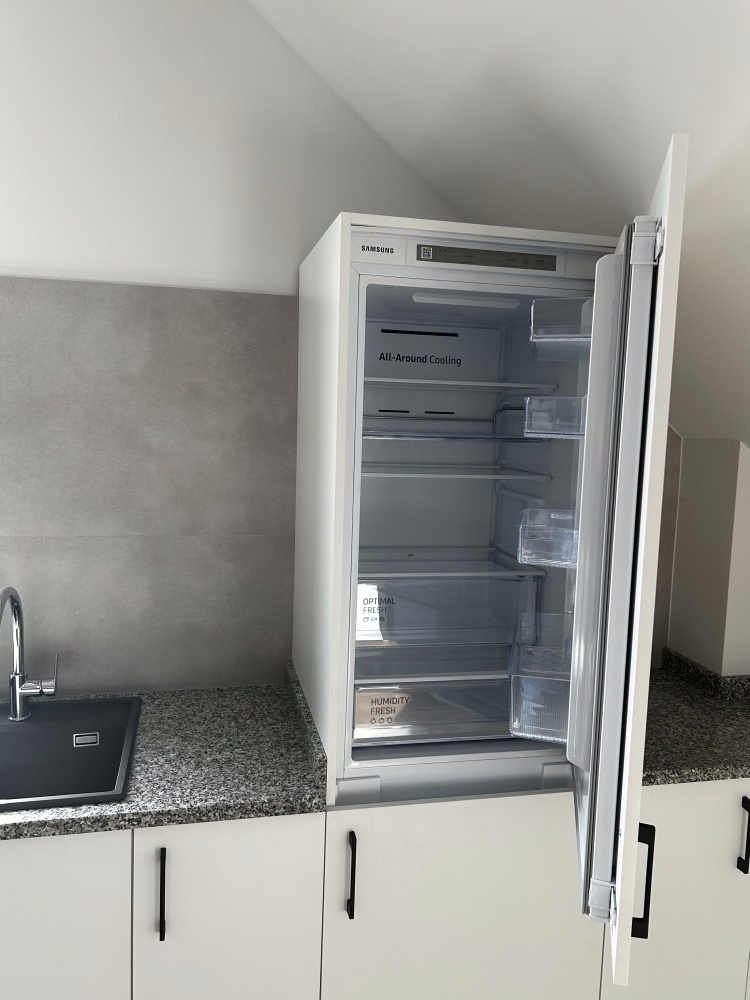 - Przestronny salon z aneksem kuchennym (ok. 42 m²) – wygodna kanapa z funkcją spania, nowoczesne wyposażenie AGD marki Samsung: piekarnik, kuchenka, lodówka z zamrażarką, okap, zmywarka.