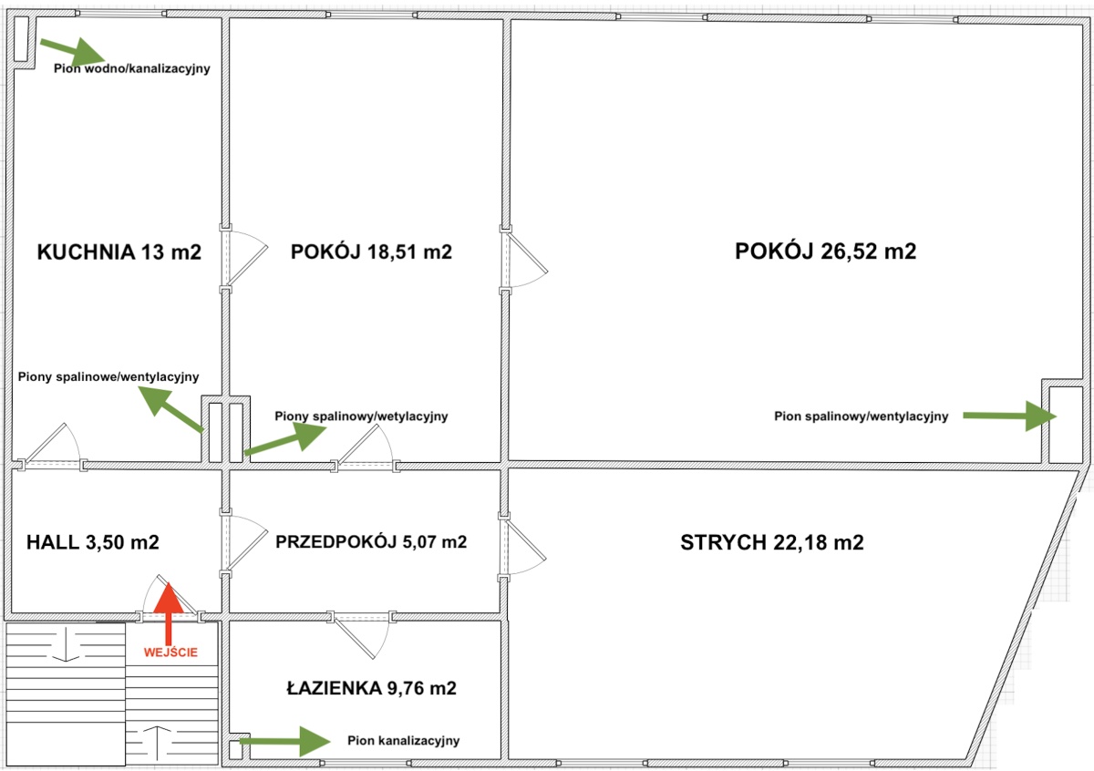 Ogrzewanie: obecne piece kaflowe, możliwość zrobienia ogrzewania elektrycznego lub piec na Pelet z rozprowadzeniem centralnym.