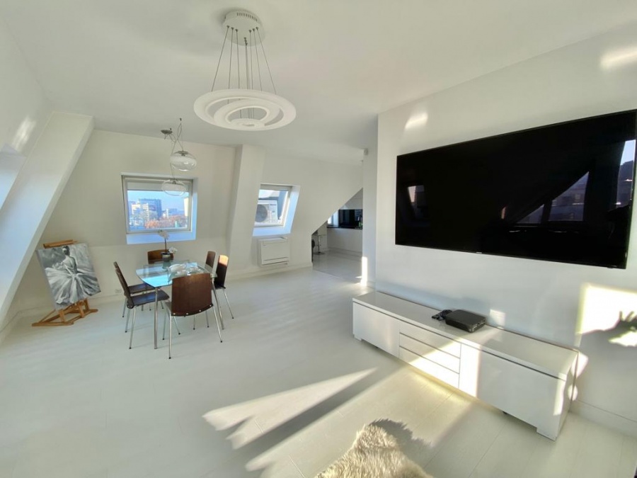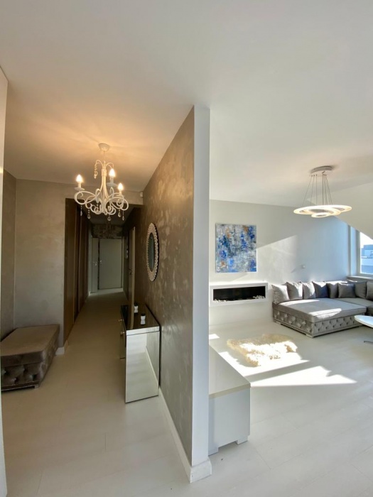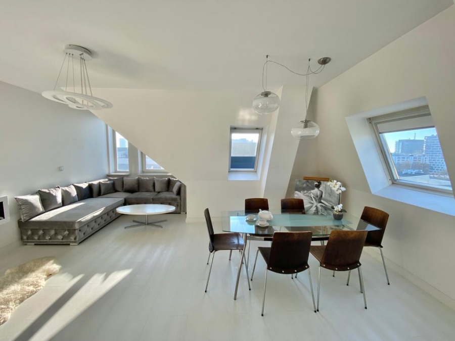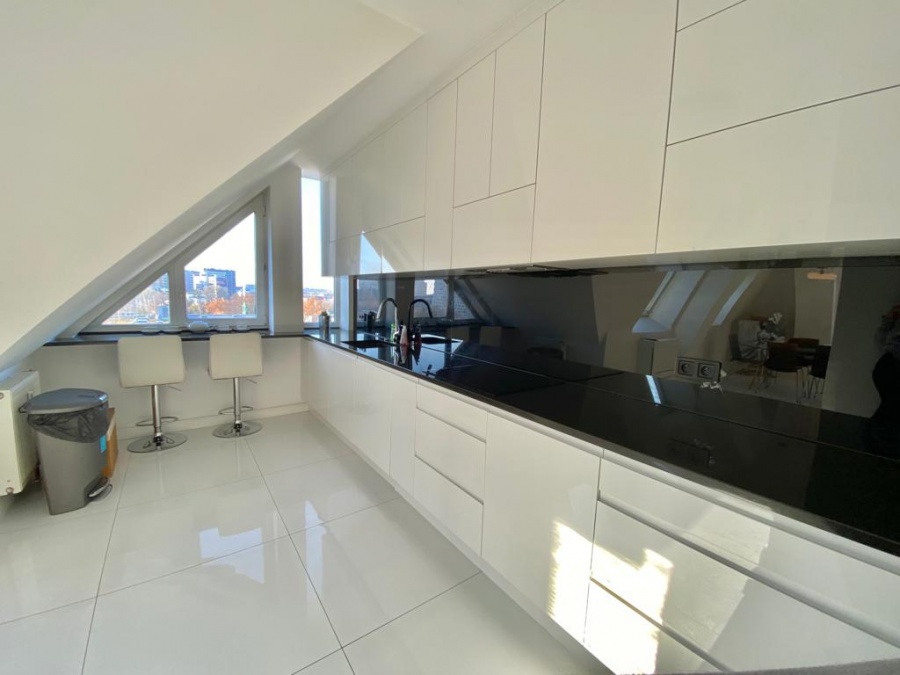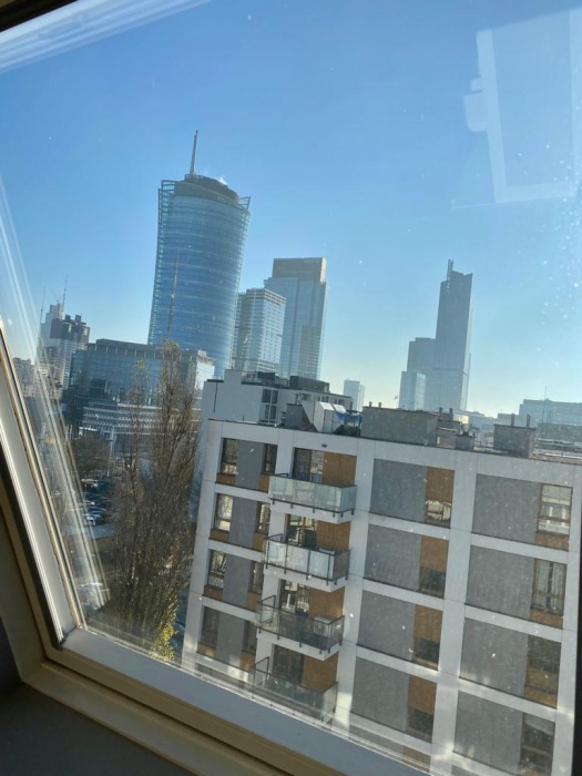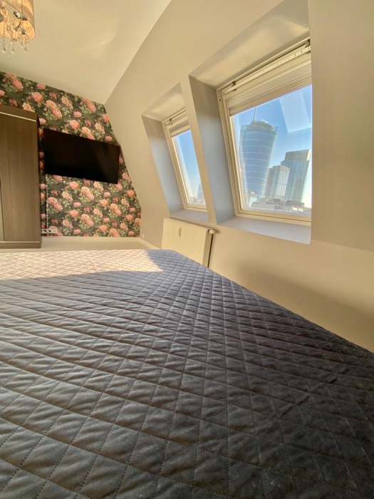 Powierzchnia całkowita - 105m2. Ekskluzywne mieszkanie w stylu „Glamour” z widokiem na panoramę wieżowców Warszawy z ostatniego piętra. Do wykończenia zostały wykorzystanie najwyższej jakości materiały. Dwie łazienki z prysznicami, łazienka w sypialni ma również bidet. Mniejsza łazienka ma sufit z lustra. Dostęp do dużej łazienki i garderoby z głównej sypialni. Nowa klimatyzacja. Duży przestronny salon z biokominkiem oraz dużym 75-cio calowym telewizorem. Drugi telewizor w sypialni. Drzwi w sypialniach akustyczne - z wygłuszeniem. Rolety w oknach typu blackout. Kuchnia w pełni wyposażona m.in. piekarnik dwustrefowy, zmywarka 60cm, płyta indukcyjna, wbudowana mikrofala, lodówka i pralka. Duże granitowe blaty i pojemne szafki. Całodobowy monitoring. Centralny alarm z czujnikami ruchu ze strefami załączania – obecnie podpisana umowa z Konsalnetem. Bardzo słoneczne mieszkanie. Umowa na okres min. 12 miesięcy. Dodatkowe informacje: wymagana kaucja w wysokości miesięcznego czynszu najmu. Koszt prądu i mediów pokrywa najemca – rozliczenia zgodnie ze zużyciem.