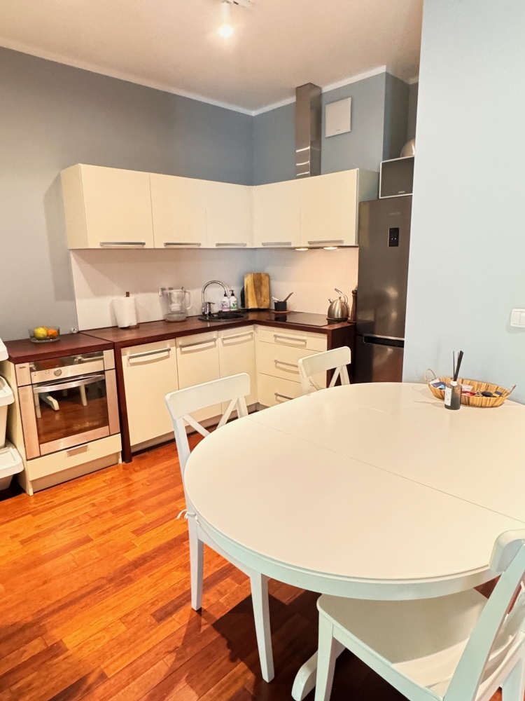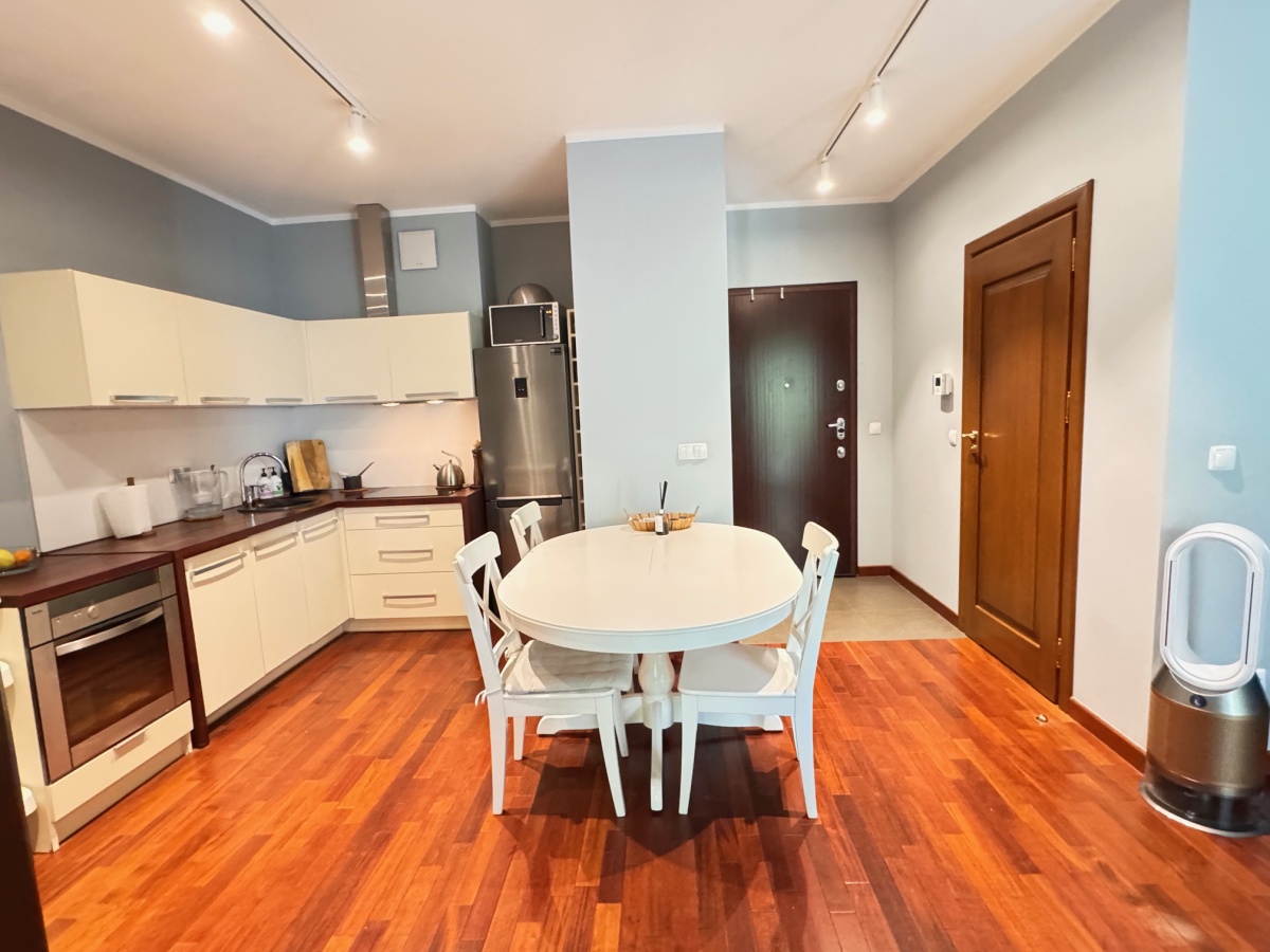 Apartament składa się z przestronnego pokoju dziennego , w pełni wyposażonego aneksu kuchennego ( lodówka , zmywarka , płyta indukcyjna ) , osobnej widnej sypialni oraz łazienki z podgrzewana podłogą i prysznicem, pralką .